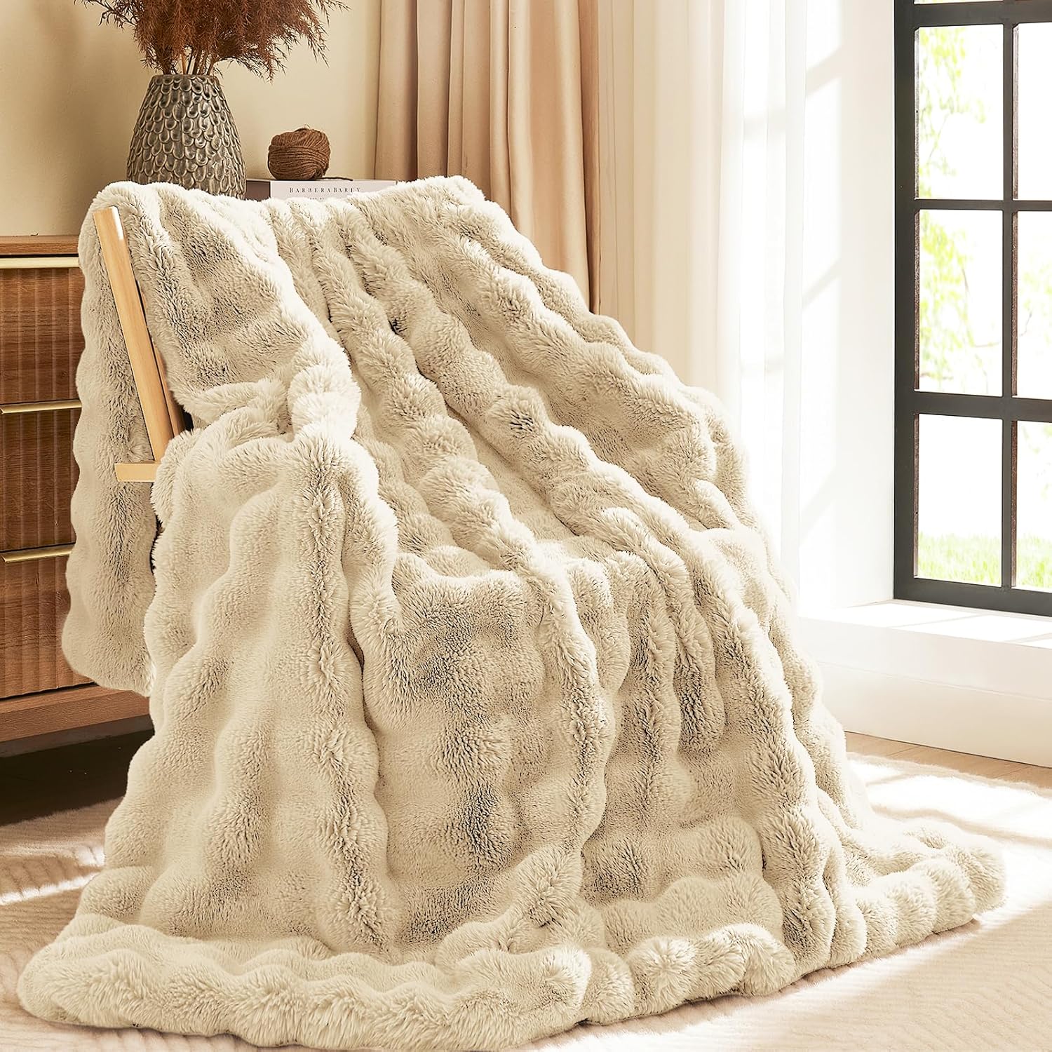 - Reversible Design & Thickness: Our faux fur aesthetic blanket is made of 650GSM rabbit fur fabric and 200GSM fannel fleece fabric lining, this plush blanket is absolutely cozy and thick, and the fabric is fade-resistant, anti-pilling, and anti-static, providing long-lasting softness and durability. The premium and beautiful double sided fabric makes the bubble rabbit fur blanket reversible for extra warmth, an ideal balance of weight and heat for the winter months