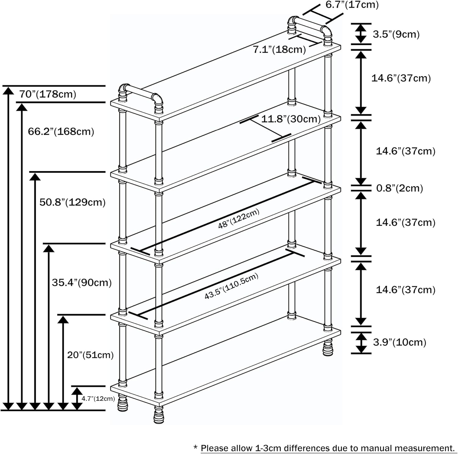 - ππππππ πππ πππππππ: Made from real 20mm wood and 25mm metal pipe, finished with a polished black color. This large open shelf bookcase is extremely sturdy and durable. The maximum safe load of each shelf is 50 lbs. With durable construction and a minimalist design, this modern-style bookshelf provides convenient storage for the bedroom or home office or a tasteful display area next to any entertainment console.