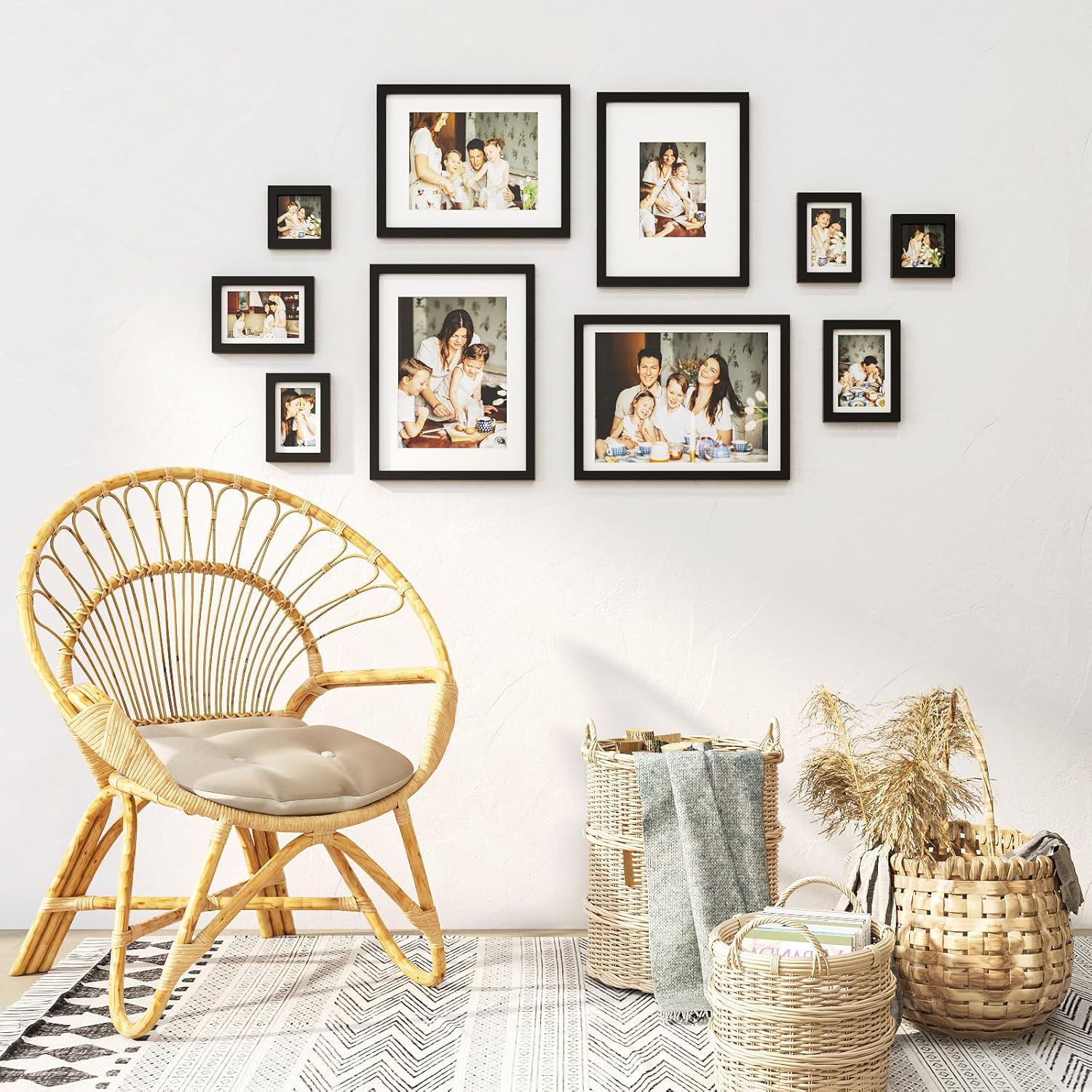 - 10 Set Black Picture Frames: This 10 pack of black photo frames includes (2) 12x16 inch frames with 2 mats for 11x14 and 8x10 pics; (2) 11x14 inch frames with 2 mats for 8x10 and 5x7 pics; (2) 5x7 inch frames with 2 mats for 3.5x5 and 4x6 pics; (2) 4x6 inch frames with 2 mats for 3x4.5 and 3.5x5 pics; (2) 4x4 inch frames without mat. Perfect for you creating a gallery wall.