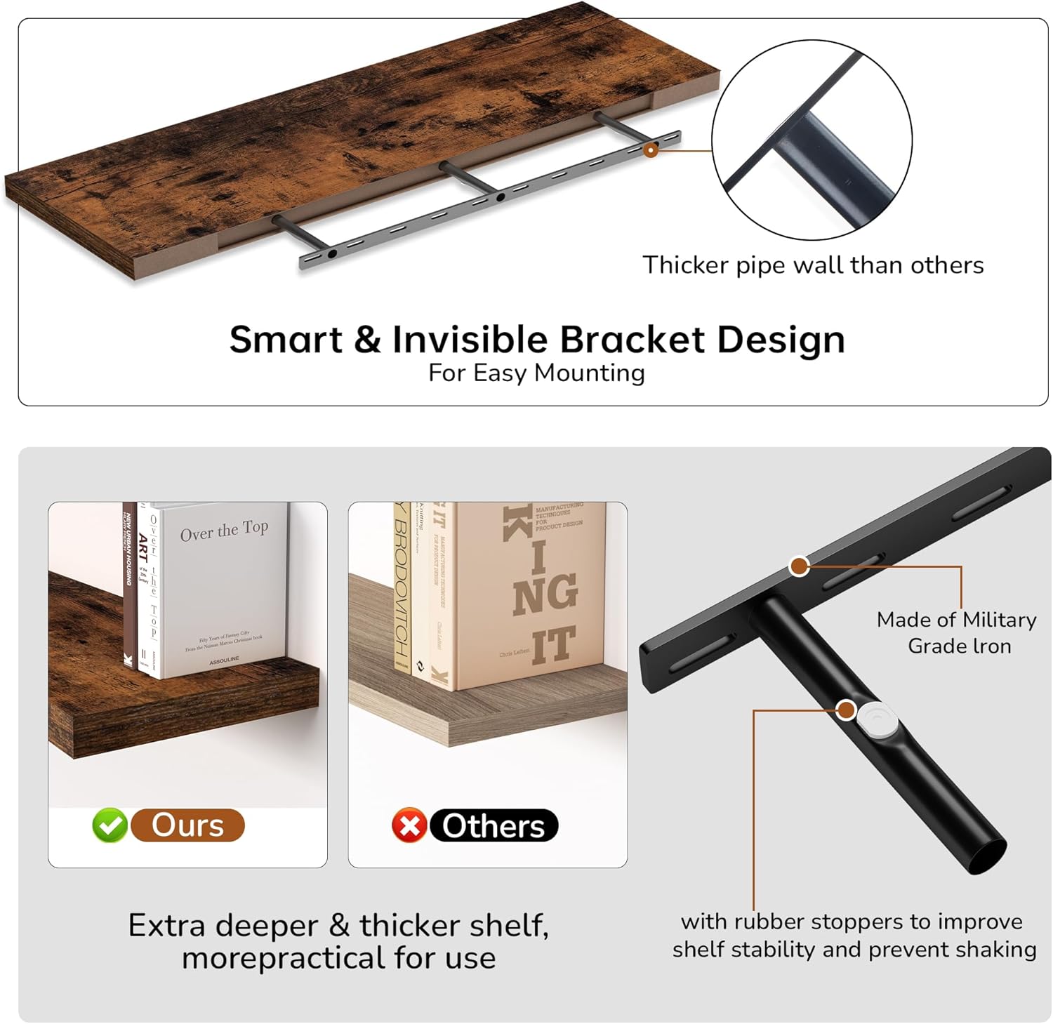 - Rustic & Modern Wooden Floating Shelves: Crafted from durable engineered wood with a realistic wood grain finish, our floating shelves offer the perfect blend of rustic charm and modern minimalism. The matte surface enhances its sleek, contemporary look, making it ideal for any room in your home. Whether you want to display your collection or organize essentials, these wall shelves seamlessly integrate with any décor and can be mounted on any wall to elevate your living space.