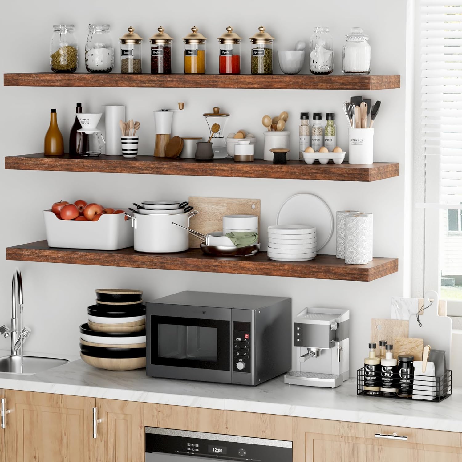- Versatile & Multi-Scene Functionality: Our floating shelves are available in a variety of sizes and thicknesses, allowing you to choose the perfect fit for your space. Use them in the bathroom to store beauty products, hair care items. In the bedroom, they can hold books, cosmetics, and personal items. In the kitchen, they’re perfect for spices, jars, or small utensils. Or display photo frames, trophies, or collections in the living room. These shelves efficiently use wall space to create a tidier, more spacious feel in any room.