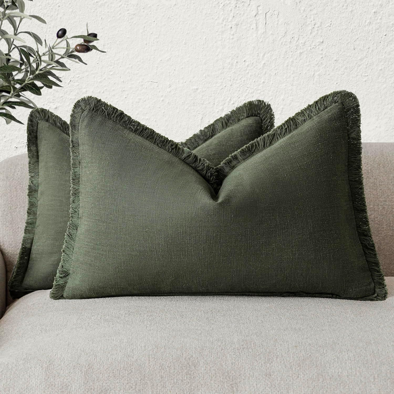 Foindtower Set of 2 Decorative Linen Fringe Throw Pillow Covers Farmhouse Cushion Cover with Tassels Accent Pillowcase for Couch Bed Sofa Living Room Home Bedroom Decor,12×24 Inch,Dark Olive Green