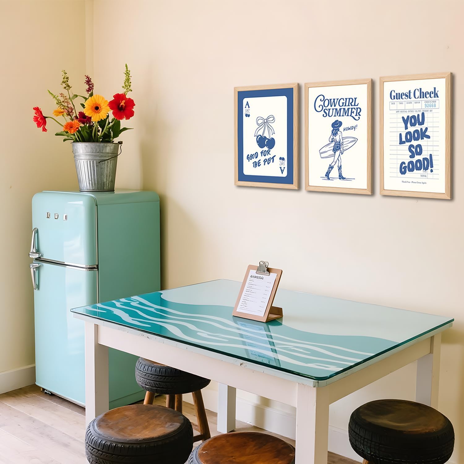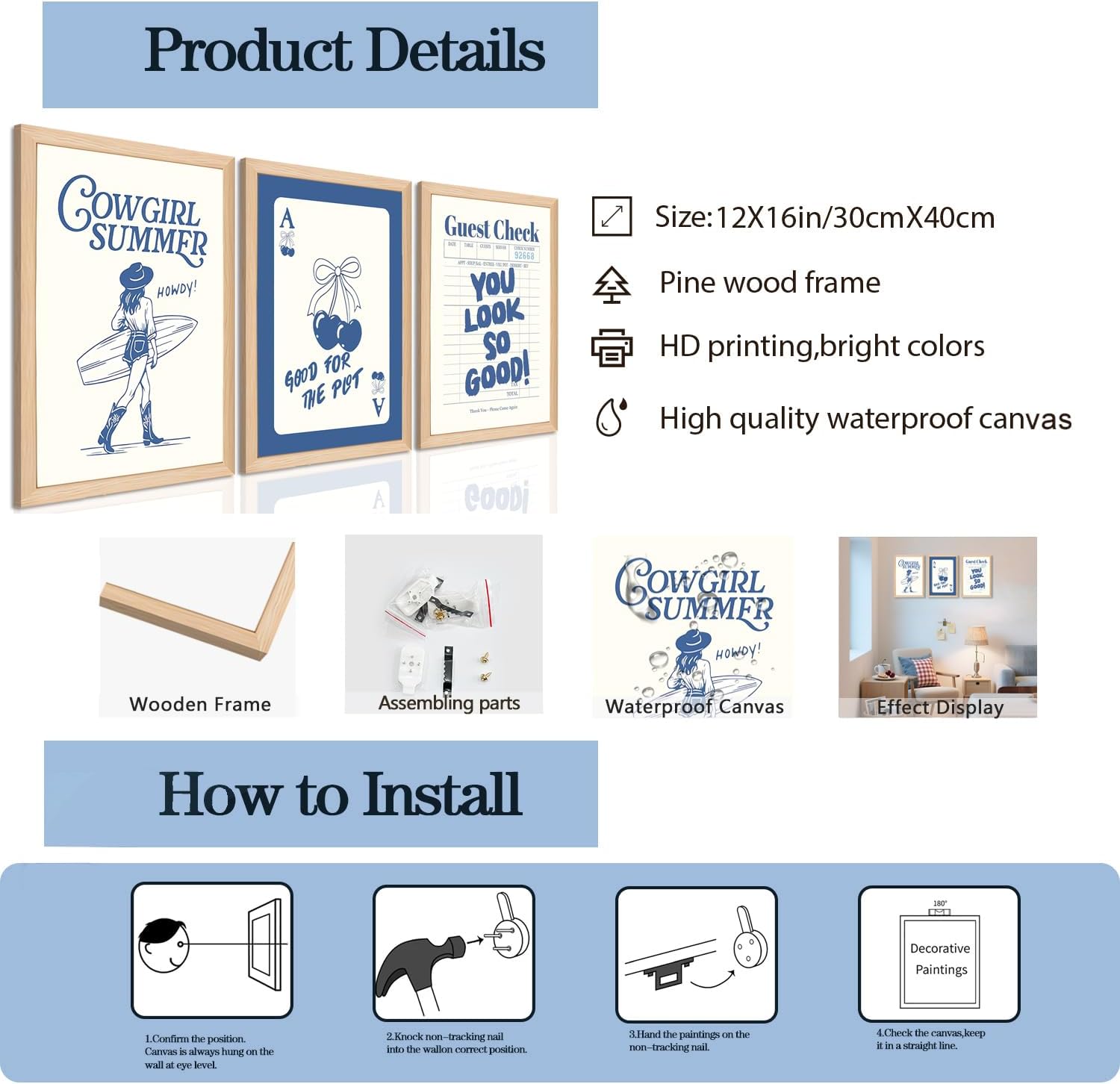 - 【Preppy Canvas Wall Art】 Trendy blue preppy canvas wall art set of 3, featuring a surfboard-toting cowgirl, cherries, and playful quotes that blend funky and cute in vibrant coastal cowgirl pictures wall decor