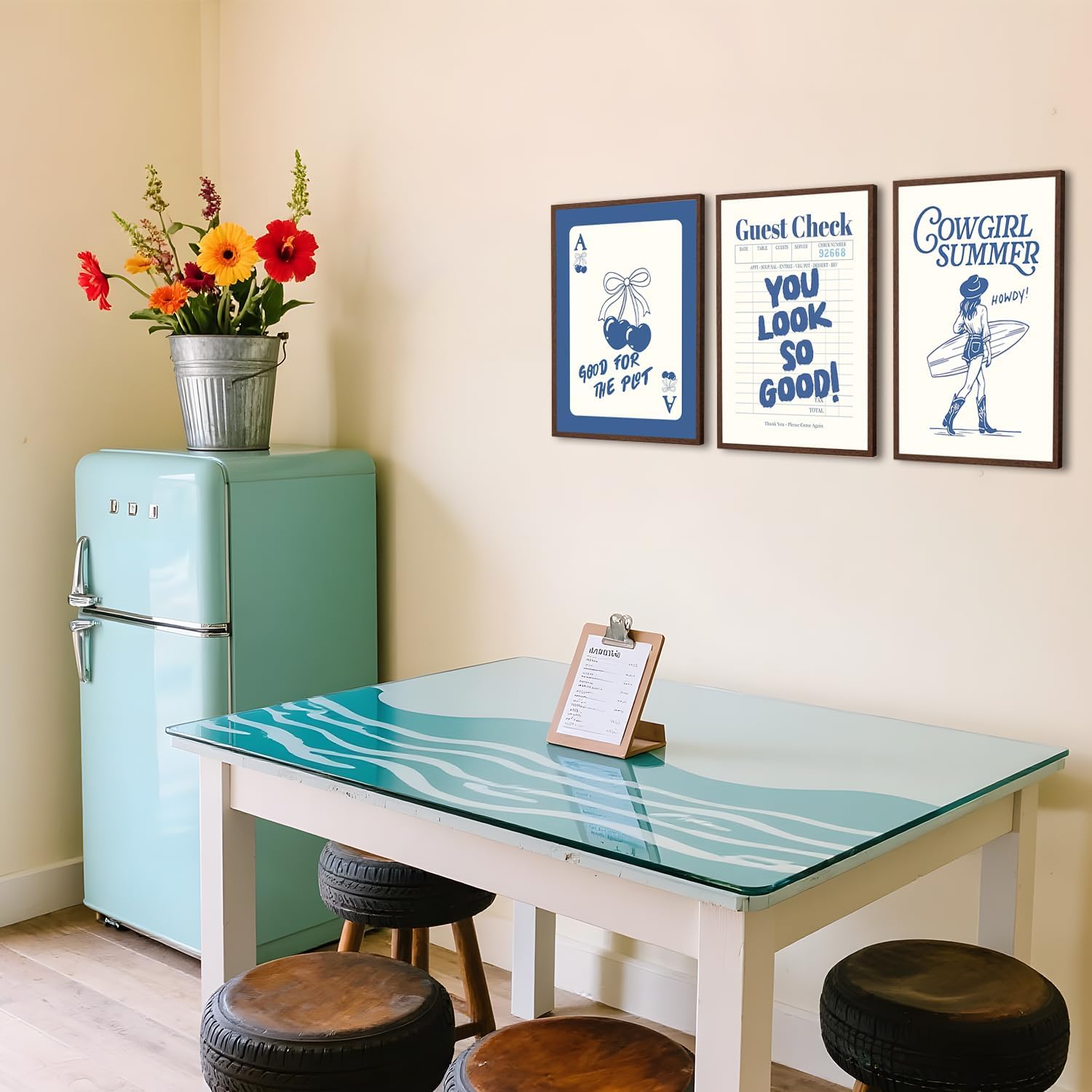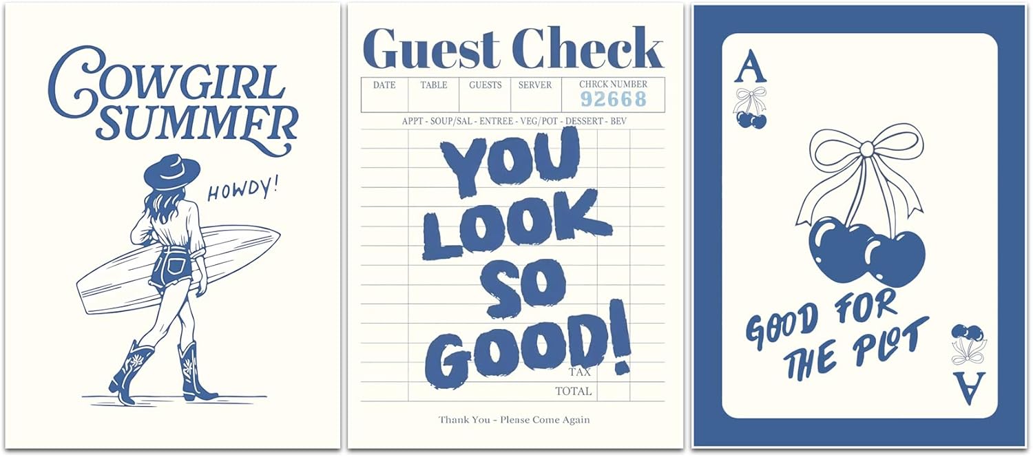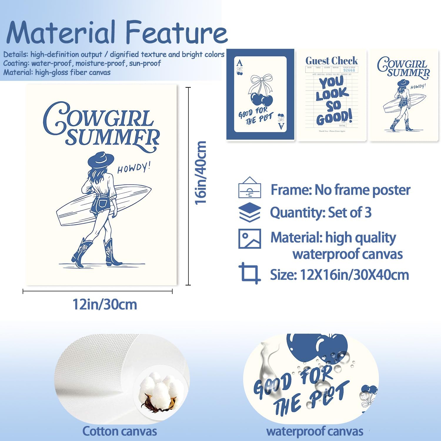 - 【Preppy Canvas Wall Art】 Trendy blue preppy canvas wall art poster set of 3, featuring a surfboard-toting cowgirl, cherries, and playful quotes that blend funky and cute in vibrant coastal cowgirl pictures wall decor