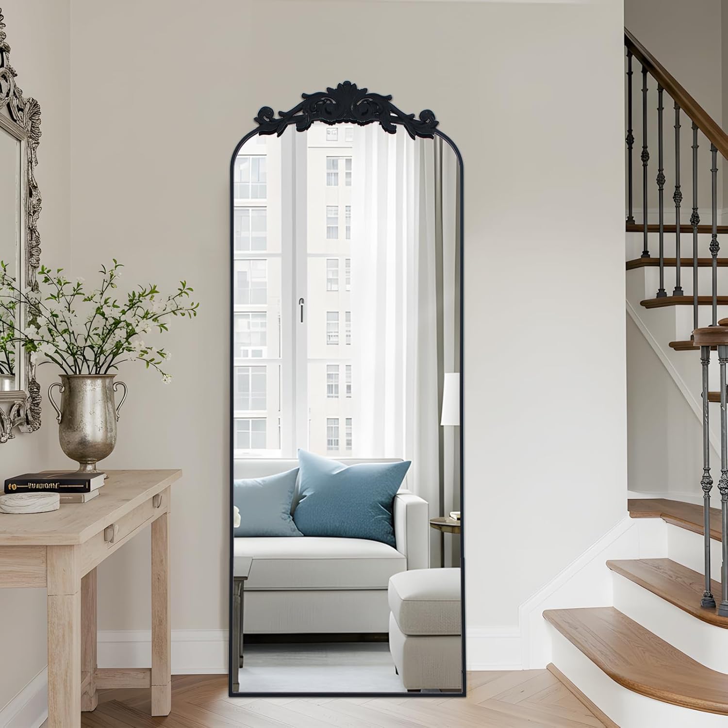- Black Aluminum Alloy Framed Floor Mirror with Vintage Ornate Carved Applique: The full length standing mirror features a modern style that can complement any type of room decor, adding a touch of elegance to your room, move light around and create the illusion of depth and space. This full body mirror with sleek looking is also great for selfies or pictures in general