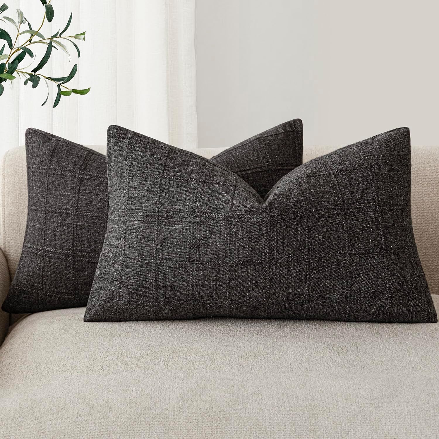 Foindtower Set of 2 Decorative Linen Check Throw Pillow Covers Neutral Farmhouse Lumbar Cushion Covers Modern Boho Home Decor for Sofa Chair Couch Bedroom Living Room,12×20 Inch,Charcoal