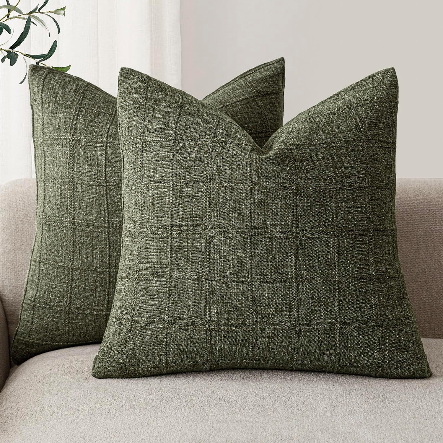 Foindtower Set of 2 Decorative Linen Check Throw Pillow Covers Neutral Farmhouse Vintage Cushion Covers Modern Boho Home Decor for Sofa Chair Couch Bedroom Living Room,22×22 Inch,Olive Green