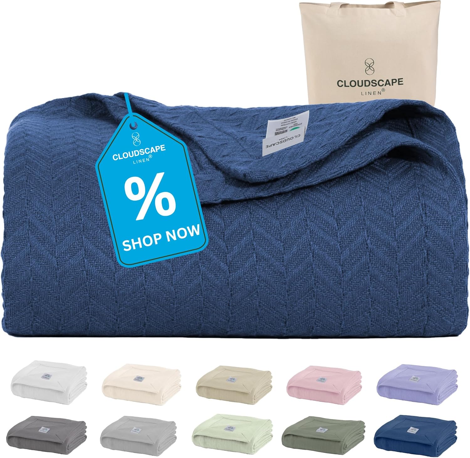 Cloud Scape Linen 100% Cotton Blanket King Size for Bed – Lightweight All Season Blanket, Herringbone Weave, for Women, Mom, Men, fits California King, 92x108, Ensign Blue