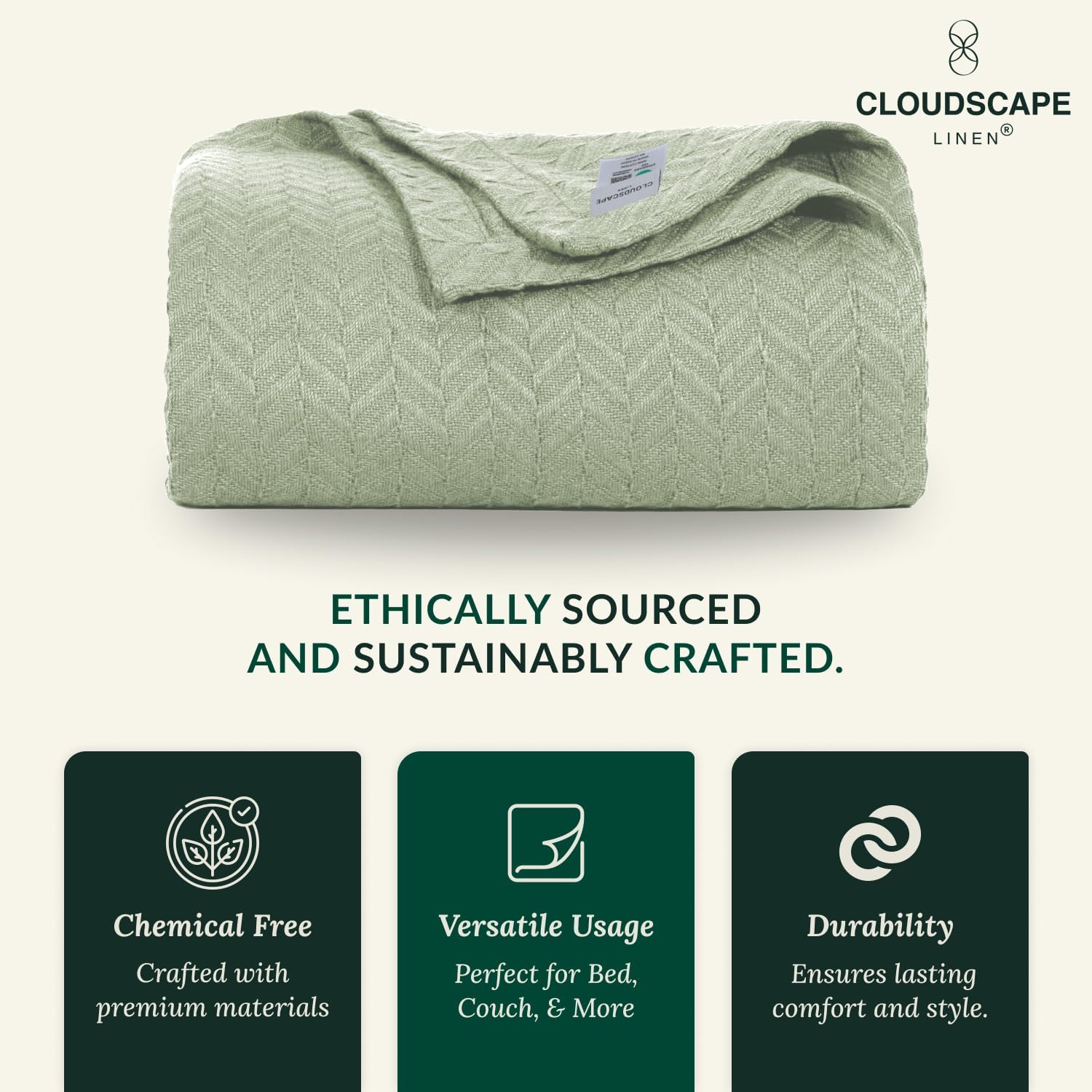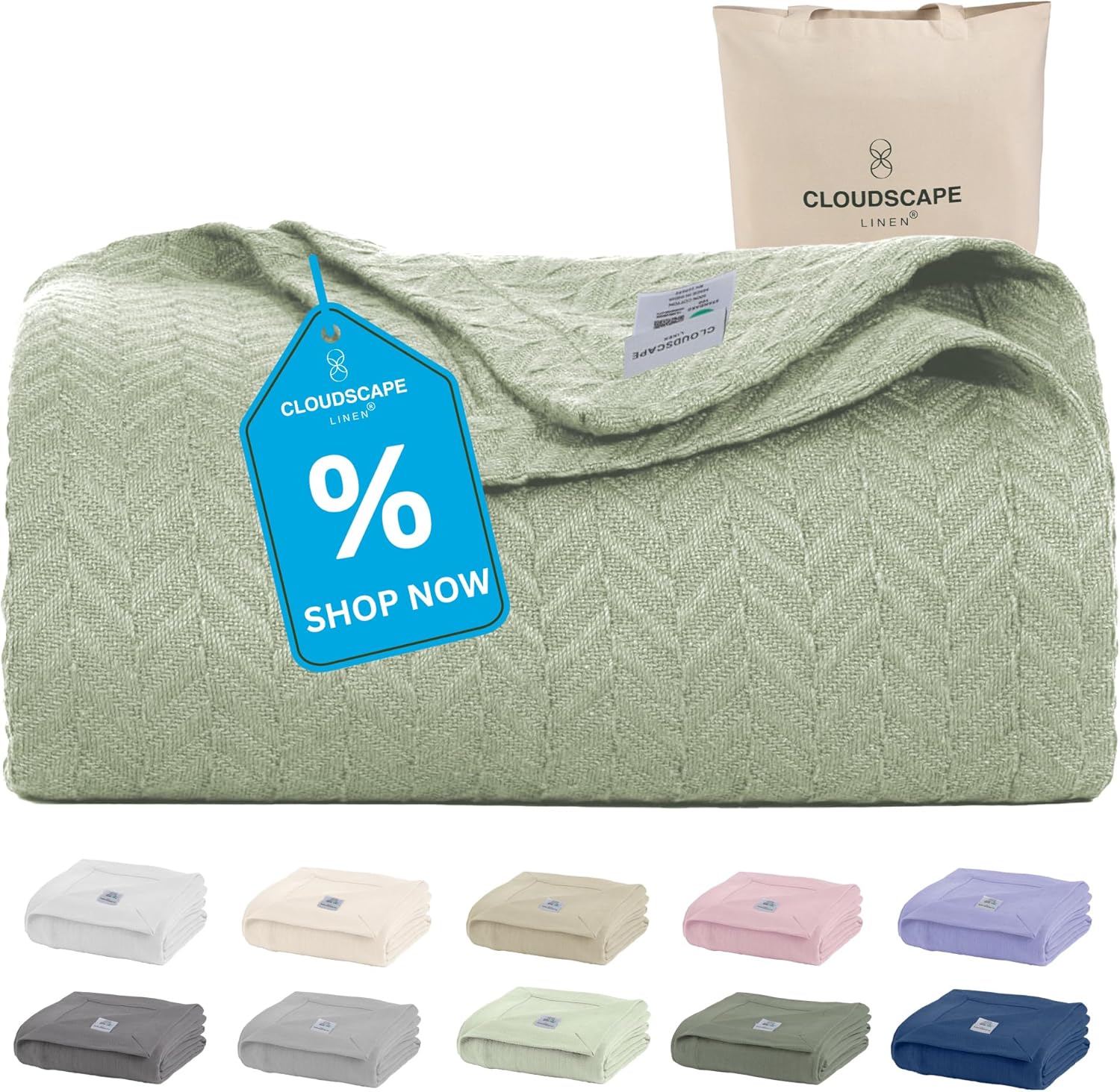 Cloud Scape Linen Herringbone Cotton Throw Blanket for Couch, Bed,Sofa, Home Decor, Soft, Lightweight, All-Season Bed Blanket, 50 x 70, Seafoam Green