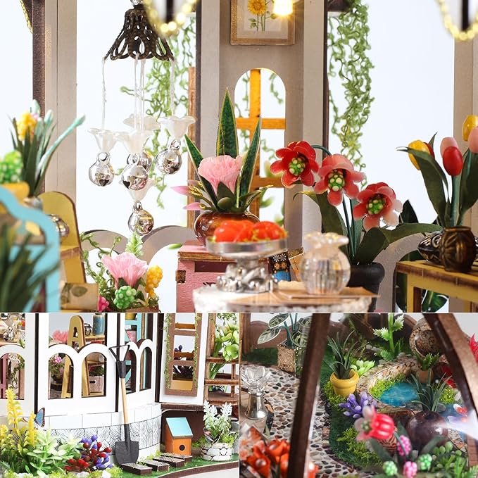 - Excellent Quality & Exquisite Designed - Materials are of excellent quality, miniature furniture and other wooden pieces are precisely cut so that they fit together perfectly. Flowers, potted plant, shelves, piano, bird house, and other ornaments, these miniature dollhouse accessories are realistic, exquisitely and simply designed, looks like a real tiny greenhouse and garden