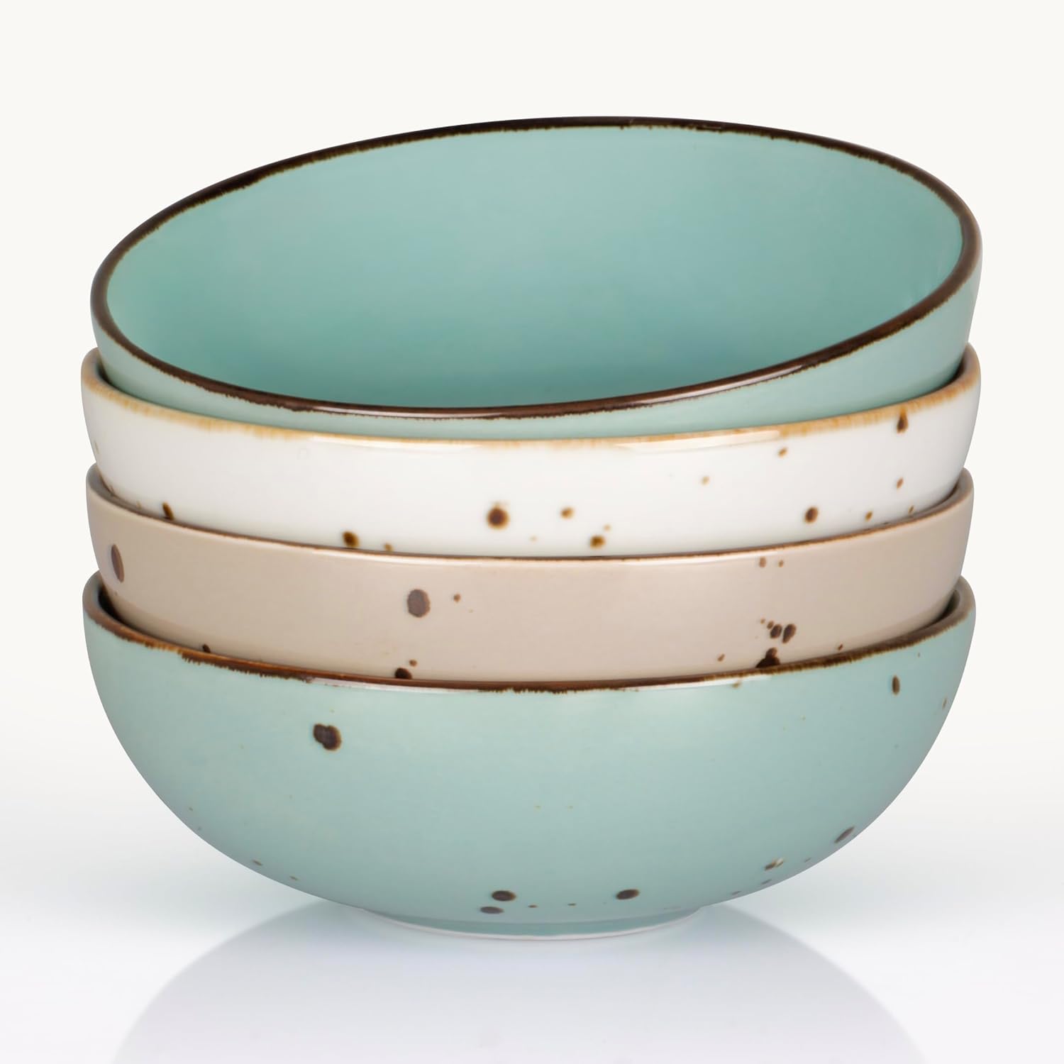 - MADE FOR HAPPY DINING: This ever-popular cottage-style porcelain salad bowl set of 4 makes a colorful addition to any modern or farmhouse decor. Our stoneware bowls are expertly painted with a reactive glaze, then kiln-fired to achieve a stunning, mottled effect that draws the eye and sets off any table setting, unlike ordinary and dull vivid dessert bowls on the market.