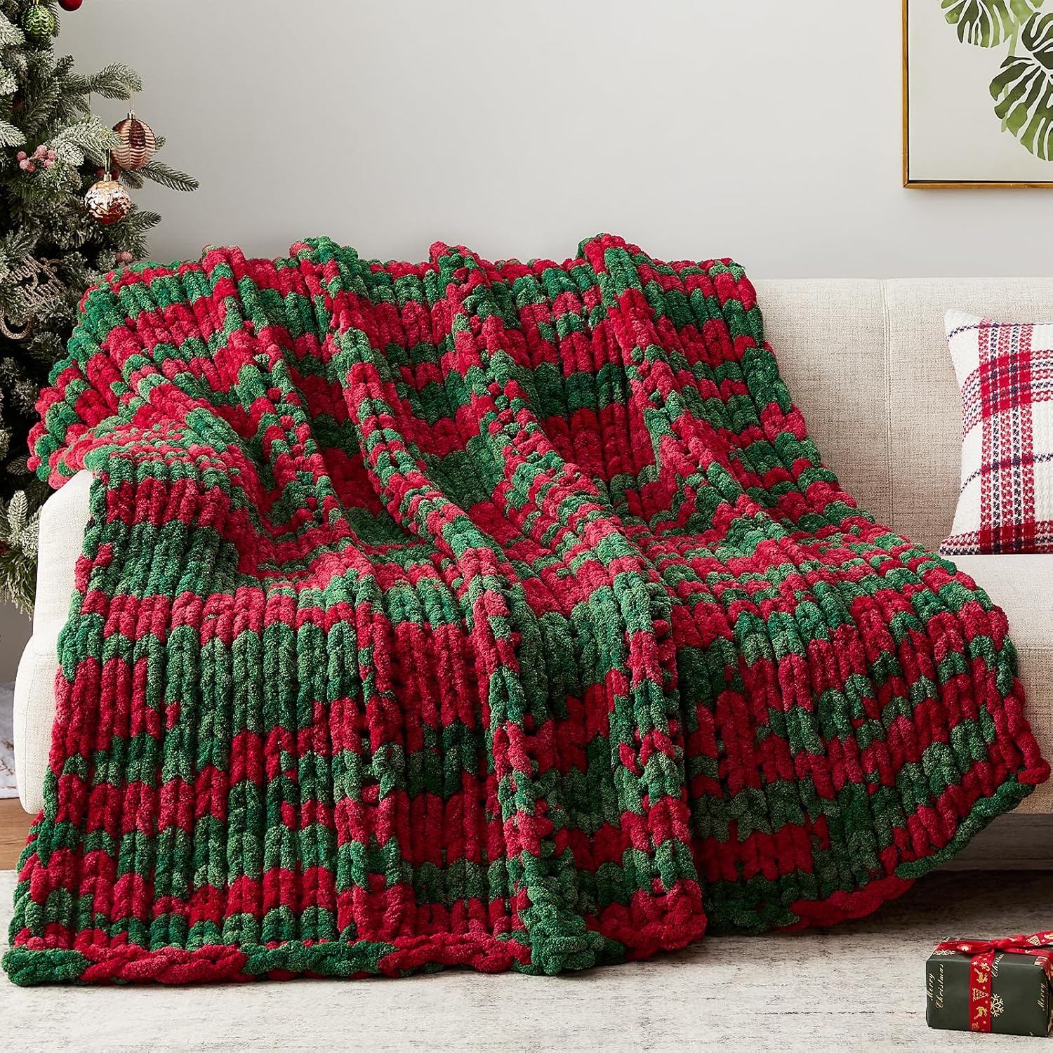 Chunky Knit Throw Blanket, 30''*40'' Knitted Throw Chenille Yarn for Bed Couch, Handmade Stripe Crochet Big Thick Blanket, Machine Washable Cute Comfy Blanket for Home Decor