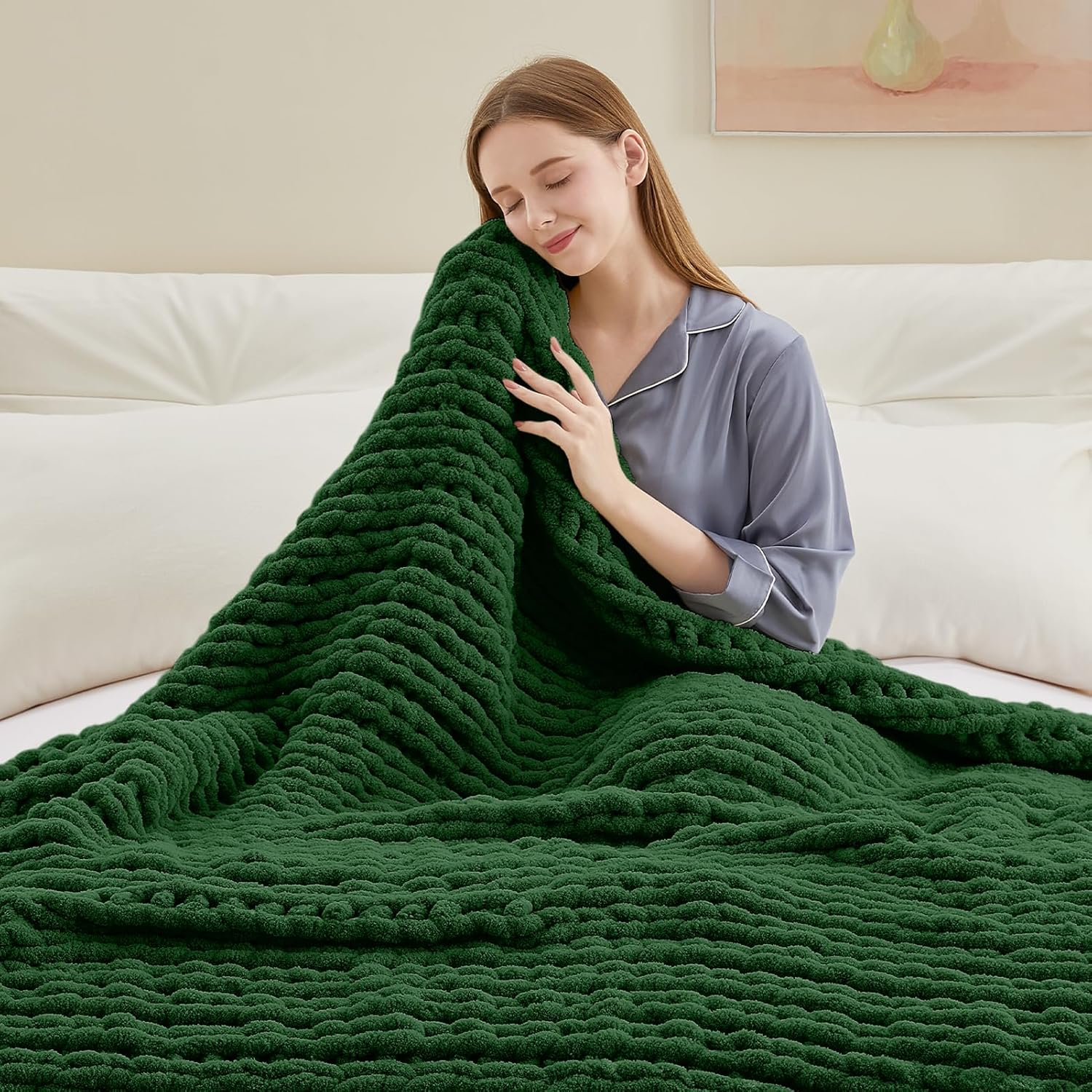 Chunky Knit Throw Blanket, 50''*60'' Knitted Throw Chenille Yarn for Bed Couch, Handmade Grass Green Crochet Big Thick Blanket, Machine Washable Cute Comfy Blanket for Home Decor