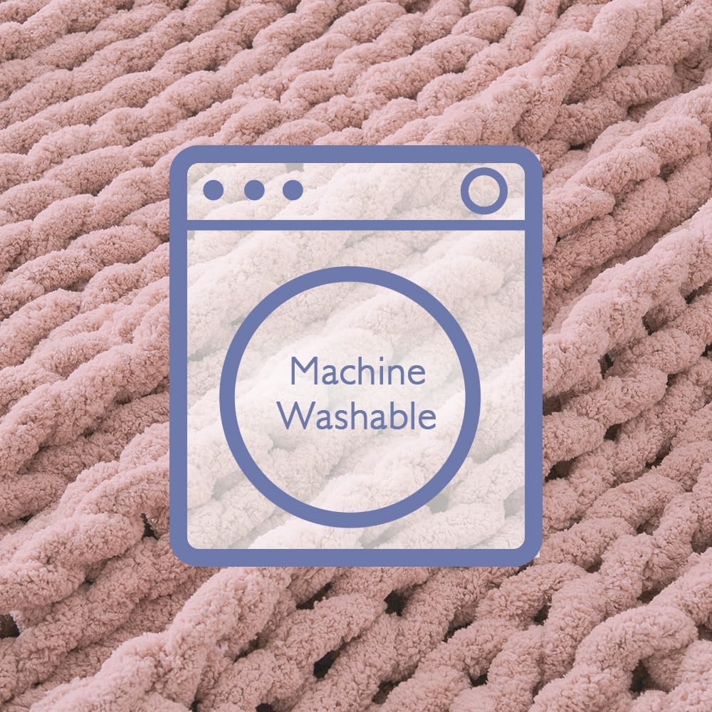 Bigacogo Chunky Knit Throw Blanket for Couch, 40x60 inches, 100% Hand Knitted with Thick Jumbo Chenille Yarn, Cozy Soft Large Rope Knot Cable Crochet Blankets for Sofa Bed Living Room, Dusty Pink