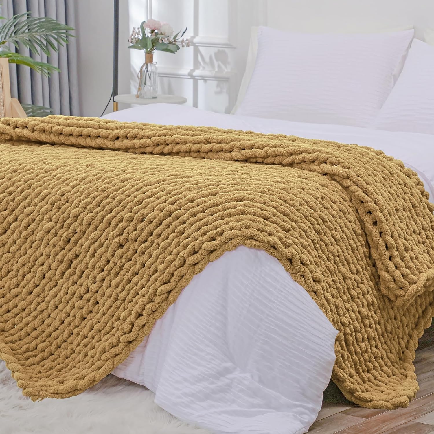 Bigacogo Chunky Knit Throw Blanket for Couch, 51x63 inches, 100% Hand Knitted with Thick Jumbo Chenille Yarn, Cozy Soft Large Rope Knot Cable Crochet Blankets for Sofa Bed Living Room, Goldenrod