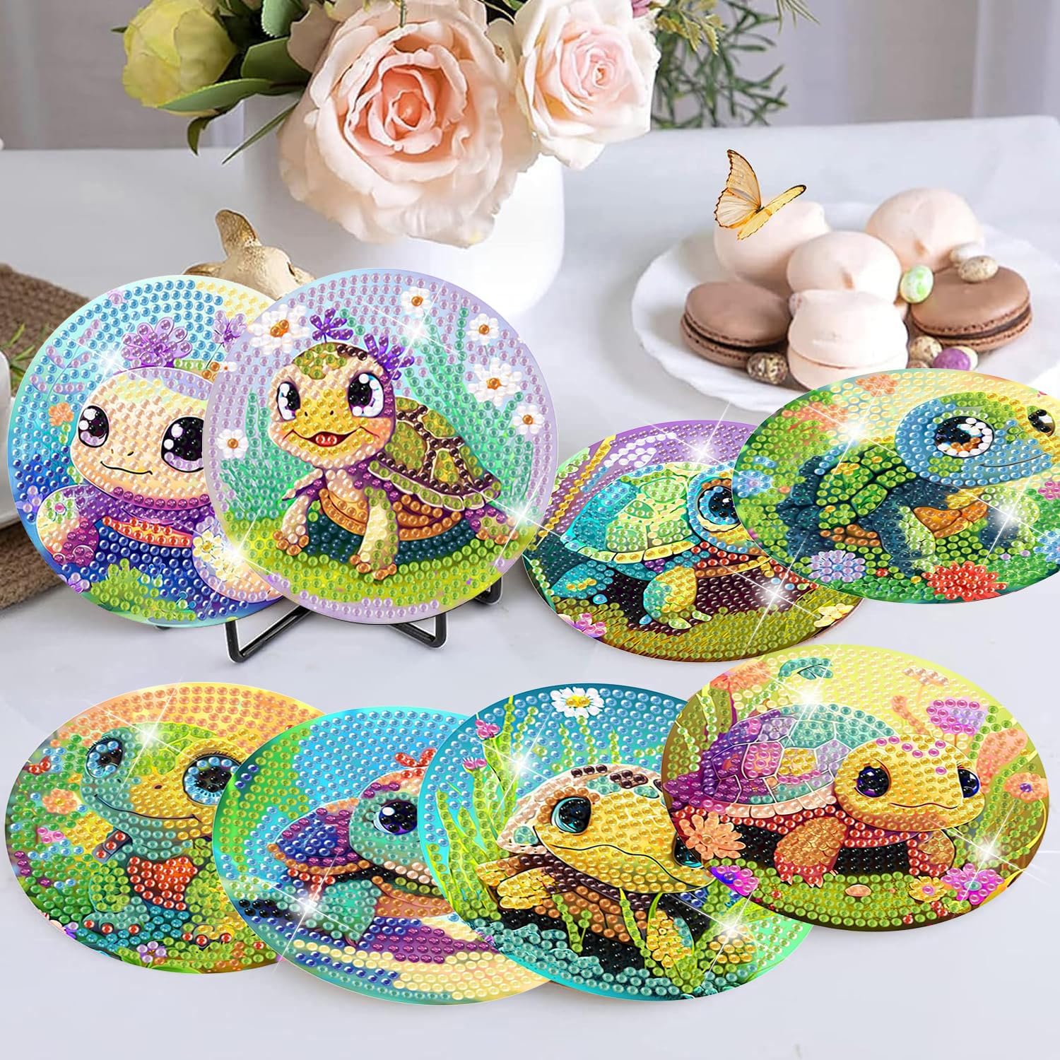 - Package Include: You will get 8 pieces diamond art painting coasters in different sea turtle theme, 8 pieces stickable cork bases, 1 pieces coaster holder, 1 pieces colorful diamonds set, 1 pieces clay glue, 1 pieces diamond art pen, 1 pieces diamond tray, contains all the accessories and tools you need for DIY diamond art painting coasters