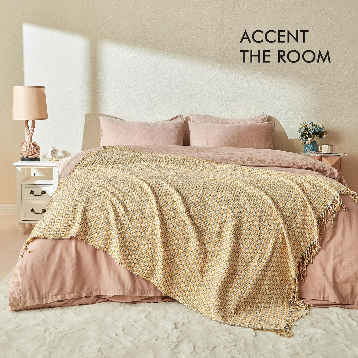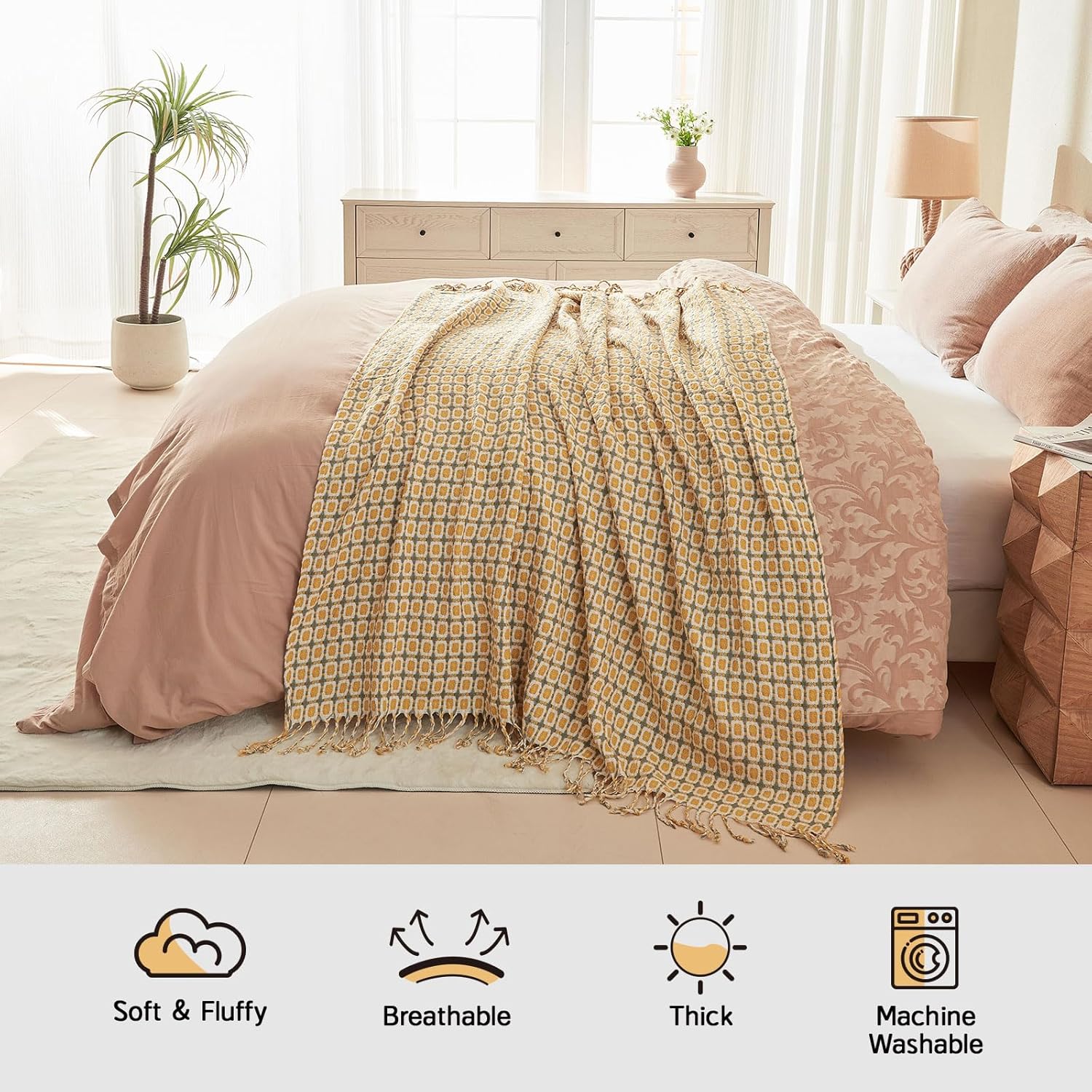 lifein Throw Blanket for Couch - Boho Throw Blanket, Knit Woven Blanket, Soft Decorative Blankets&Throws with Tassels for Bed,Sofa,Chair,Home Decor(50x60in,Yellow/Mustard)