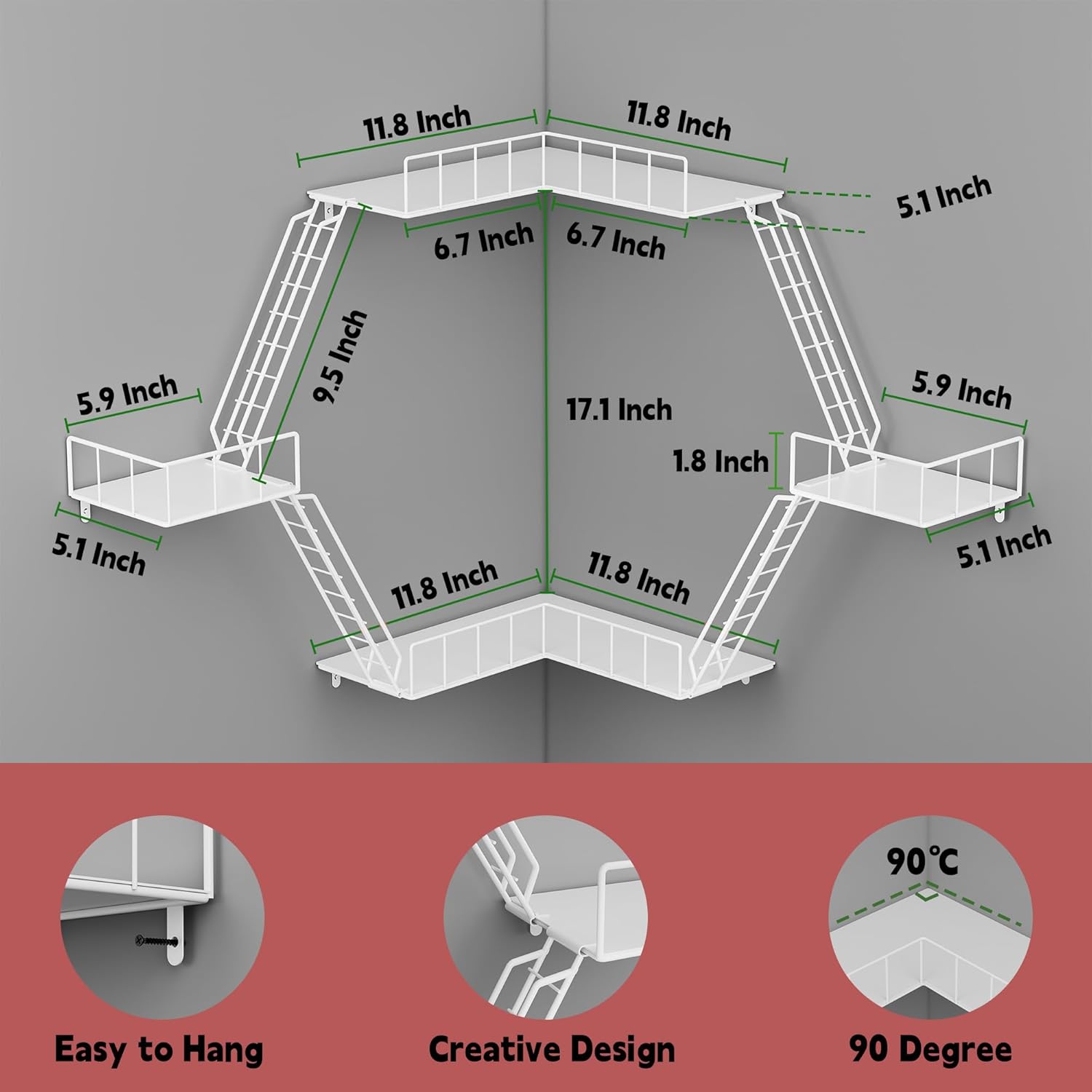 - ă2+2 FIRE ESCAPE SHELFă2 L-shaped corner floating shelves: 11.8"W x 7.9"D x 1.7"H; 2 small knick knack shelves: 5.9"W x 7.9"D x 1.7"H. The fire escape wall shelf pays homage to the cityscape with its modern and stylish look, a unique decorative shelf that adds a touch of urban style.