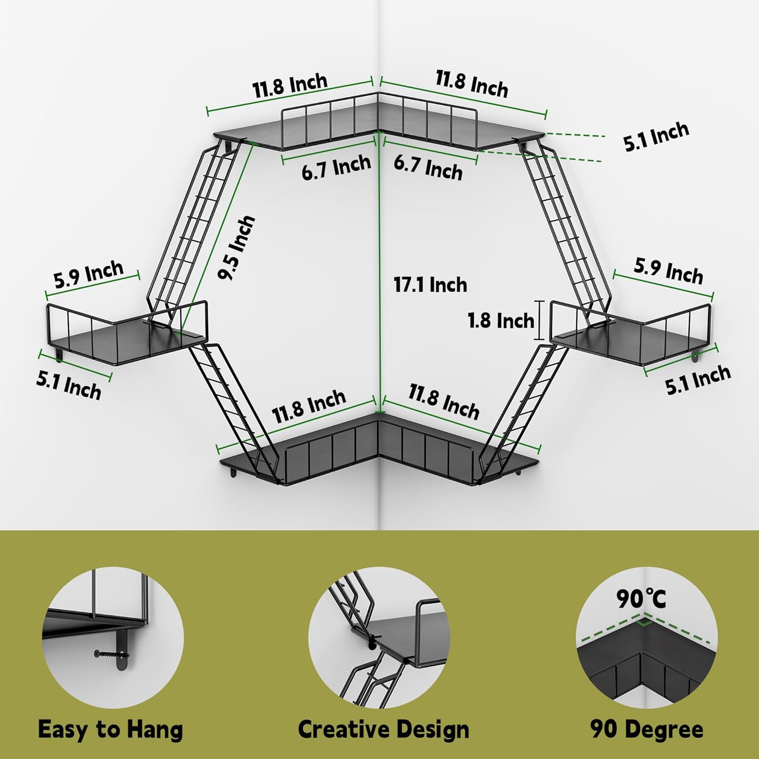 - ă2+2 FIRE ESCAPE SHELFă2 L-shaped corner floating shelves: 11.8"W x 7.9"D x 1.7"H; 2 small knick knack shelves: 5.9"W x 7.9"D x 1.7"H. The fire escape wall shelf pays homage to the cityscape with its modern and stylish look, a unique decorative shelf that adds a touch of urban style.