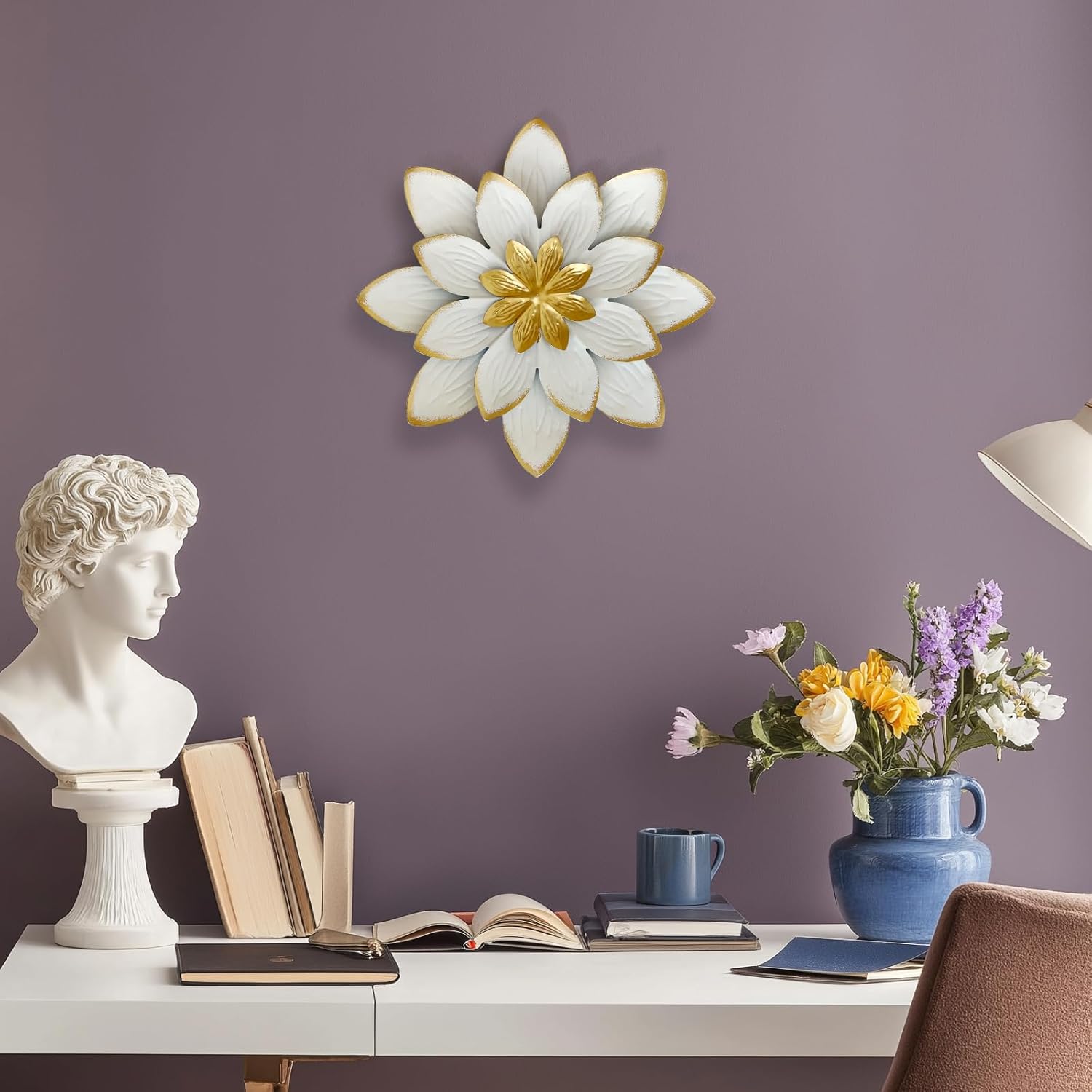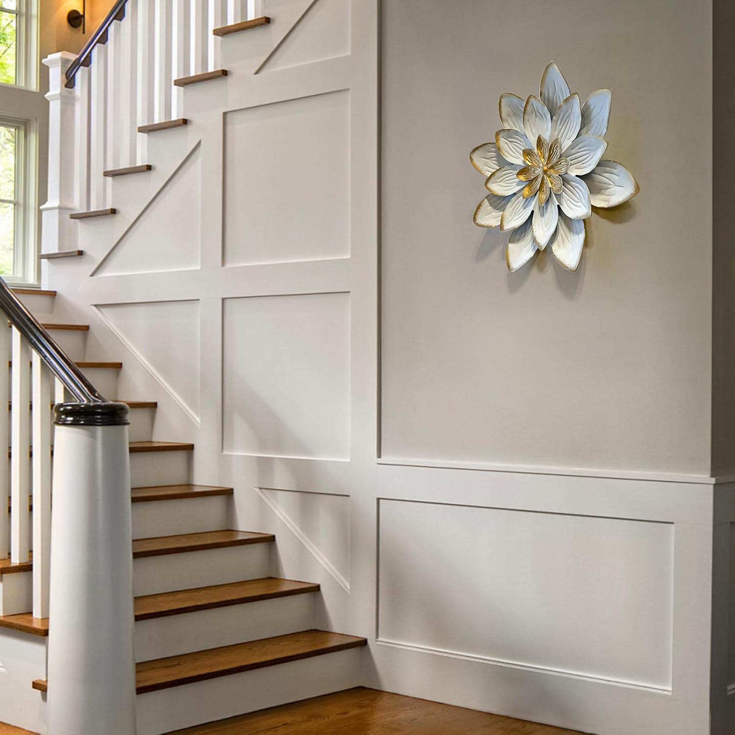 LIFFY 9.2“ White and Gold Metal Flower Wall Art, Modern Rustic Floral Decor for Indoor Living Room Bedroom Office Outdoor Garden Patio Yard