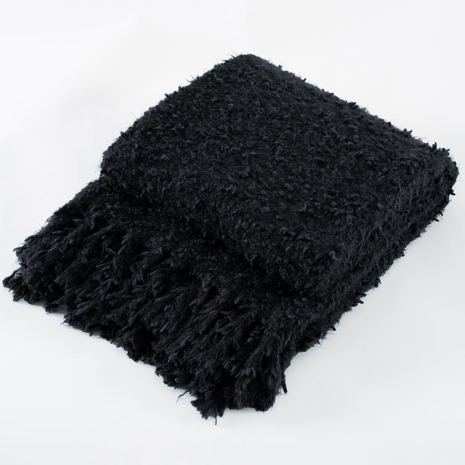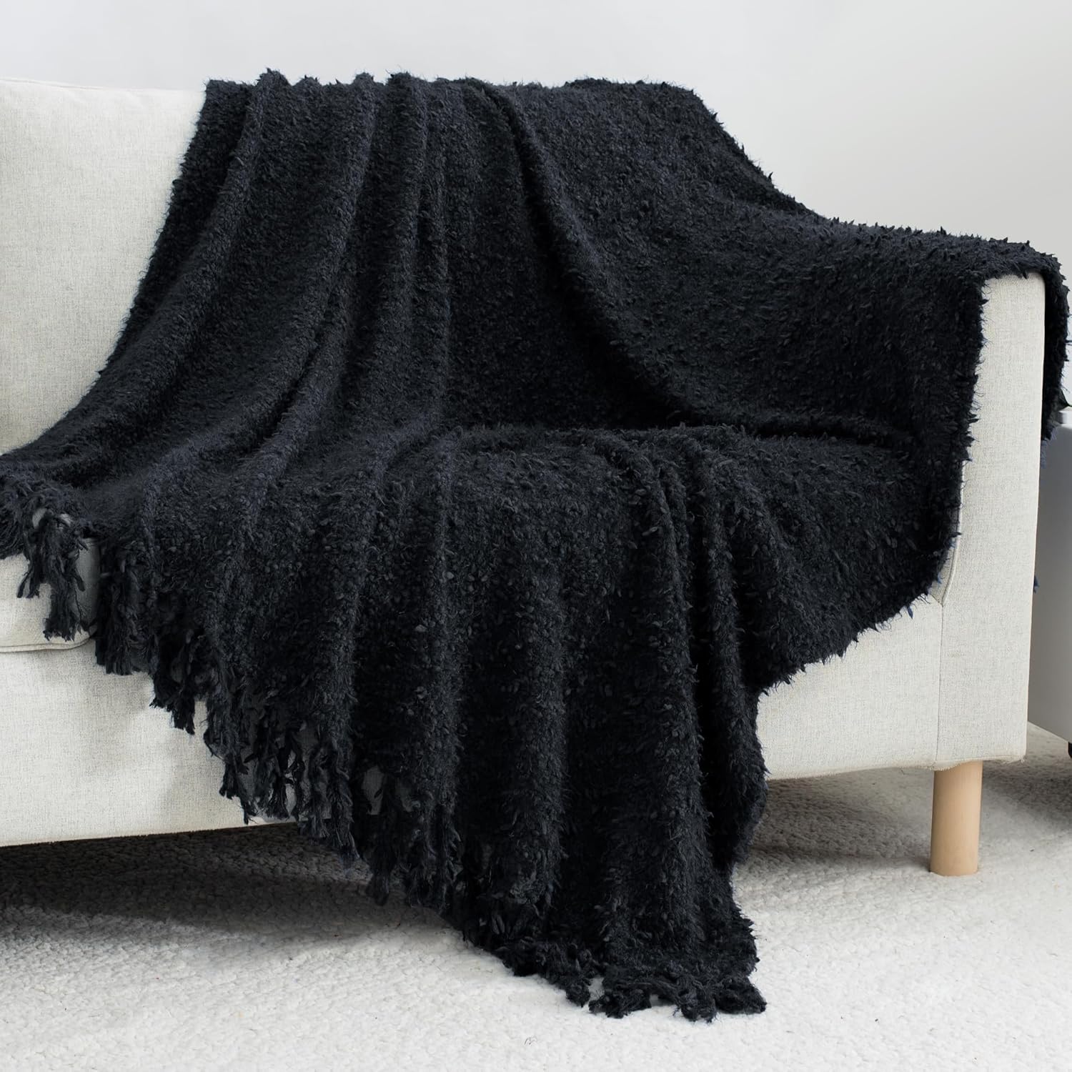 Knit Throw Blanket Fluffy Fuzzy Soft Lightweight Cozy Farmhouse Tassels Chunky Knitted Throws for Couch Sofa Bed (Black, 60"x80")