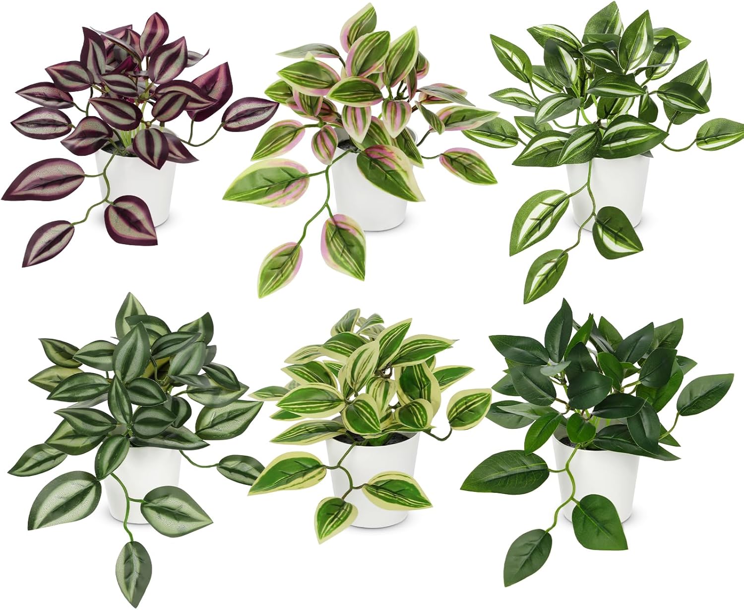 - Artificial Plants Indoor: You will get 6 completely different faux plants indoor(purple Fittonia plant*1,green&pink Wandering Jew*1,green&white Wandering Jew*1,green Wandering Jew*1,green&yellow Wandering Jew*1, green pothos Peperomia*1). Each fake plants potted comes already set in its own plastic pot for easy displaying, no need to assemble, you can directly decorate your house after you get it
