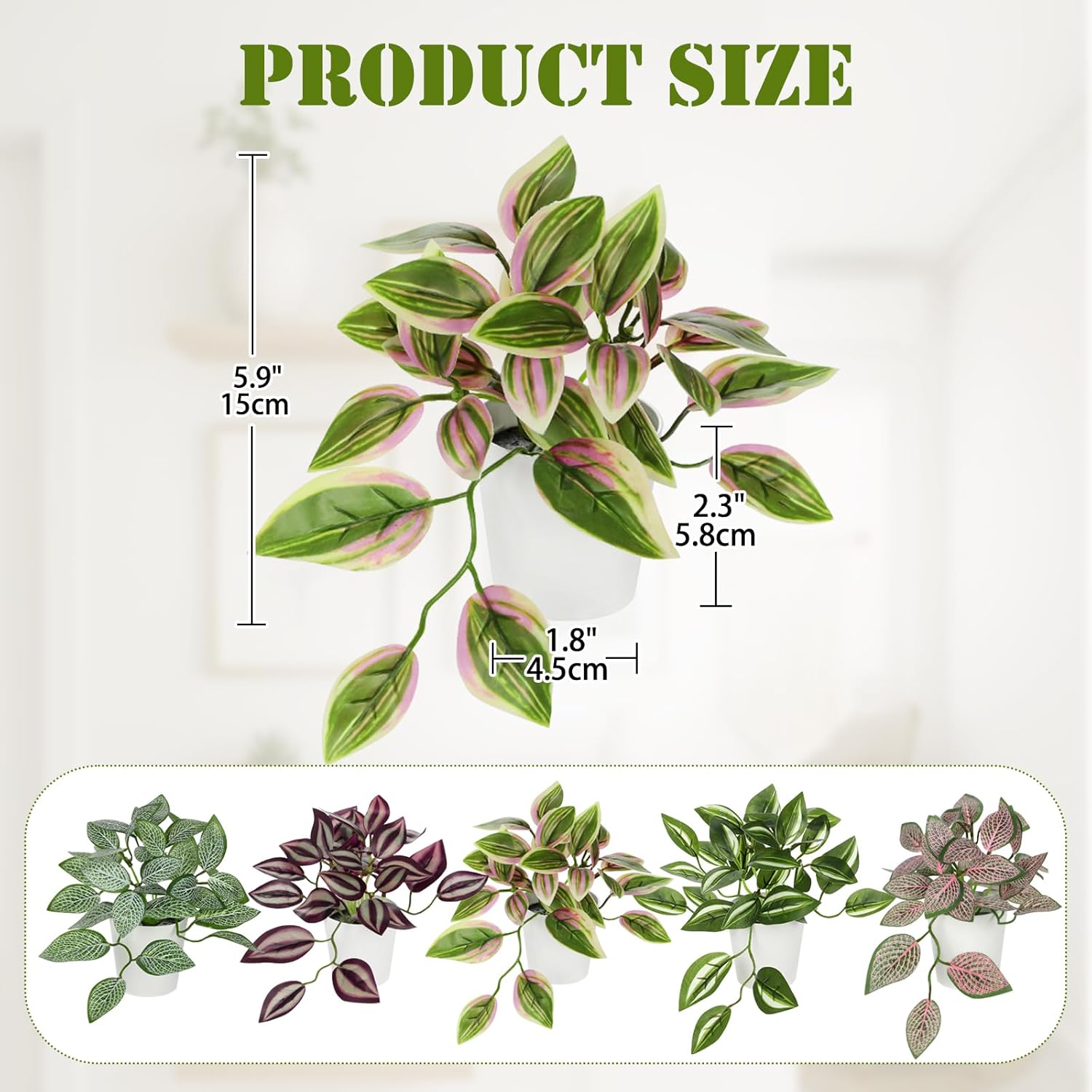 - Artificial Plants Indoor: You will get 6 completely different faux plants indoor(green&white Wandering Jew*1,green&pink Wandering Jew*2, purple Wandering Jew*1,green Fittonia plant*1,red Fittonia plant*1). Each fake plants potted comes already set in its own plastic pot for easy displaying, no need to assemble, you can directly decorate your house after you get it