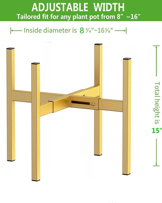 Metal Plant Stand, Adjustable Size Fits 10 12 13 14 15 16 Inches Large Planter Pot,Mid Century Expandable Plant Holder Indoor Outdoor Corner (HeavyGold, Fits all pots between 8" and 16")