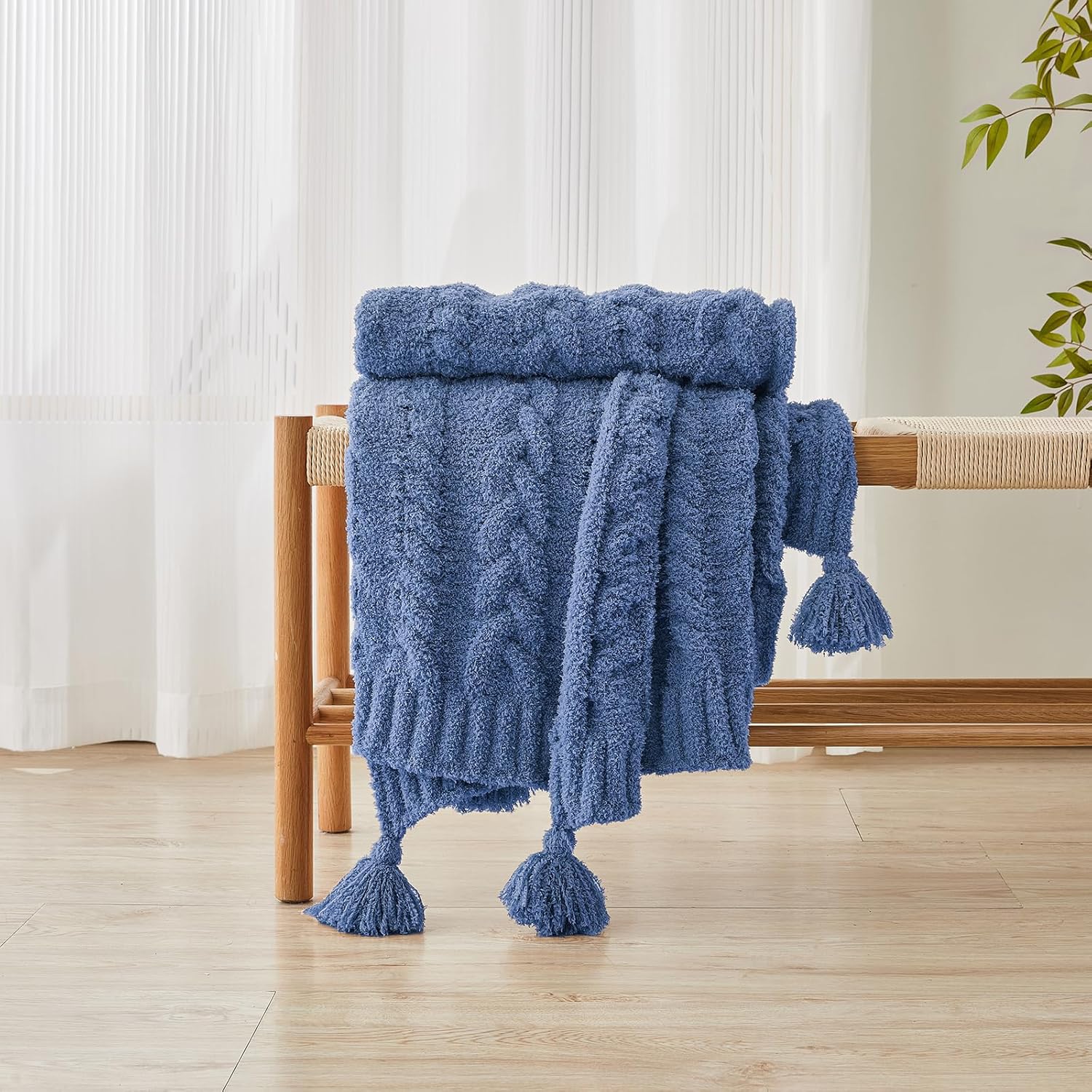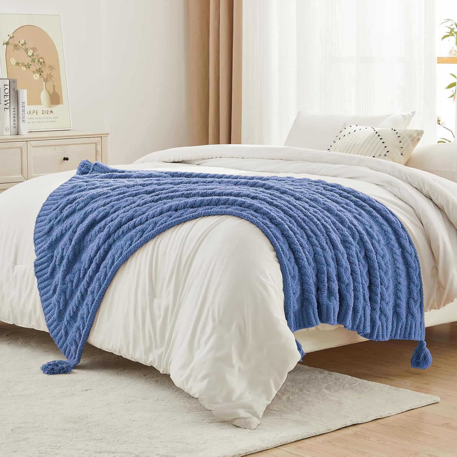 HORIMOTE HOME Chenille Chunky Knit Throw Blanket for Couch with Tassels, Soft Cozy Blanket for Sofa Chair Bed, Blue, 50"x 60"