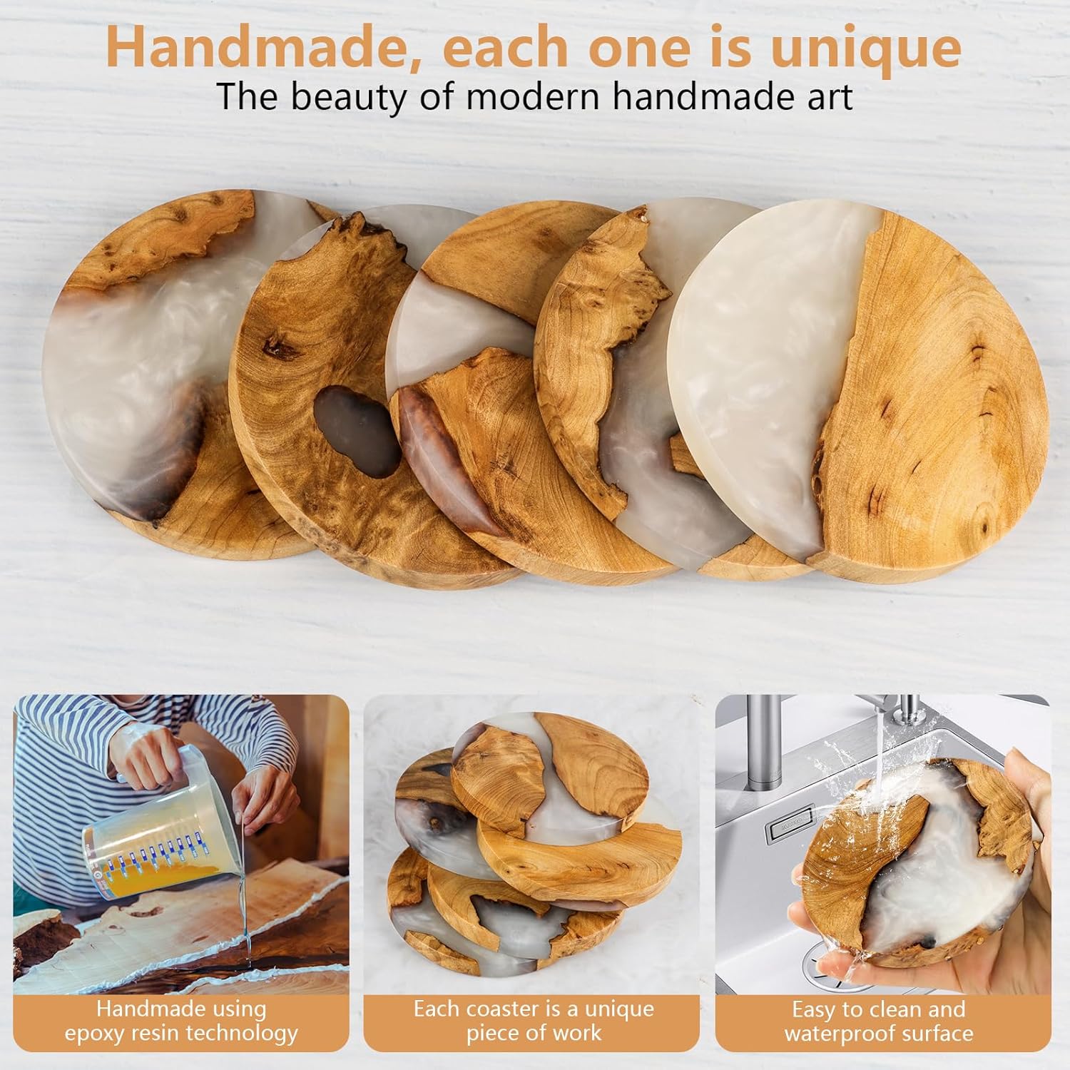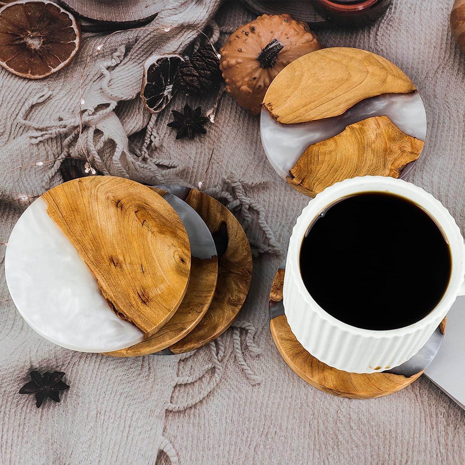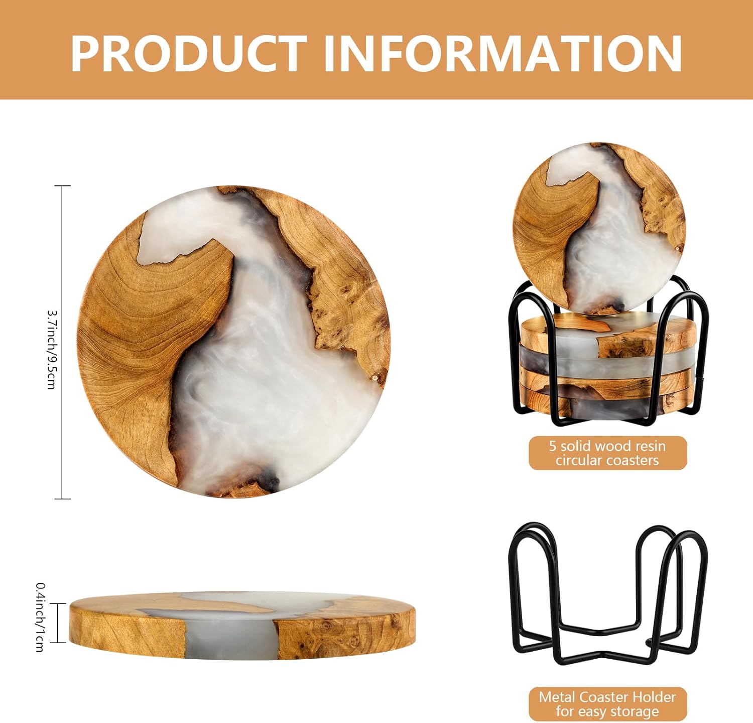 - 【Stylish Coaster Set 】A wonderful shopping experience, 5 PCS solid wood resin round coaster set with holder. A friend's surprise from as a gift for a friend,perfect for housewarming, birthdays, weddings, holidays or any other special occasions
