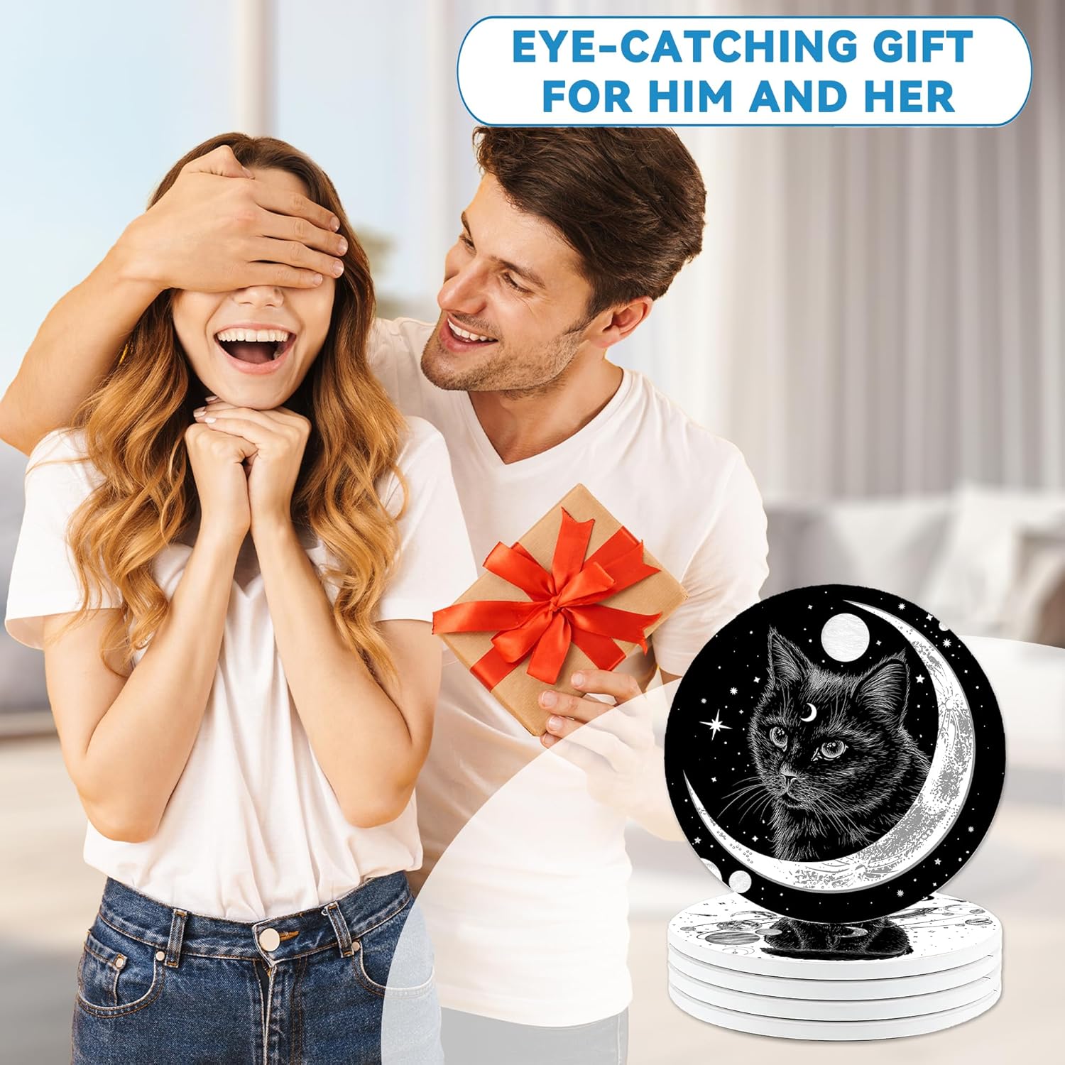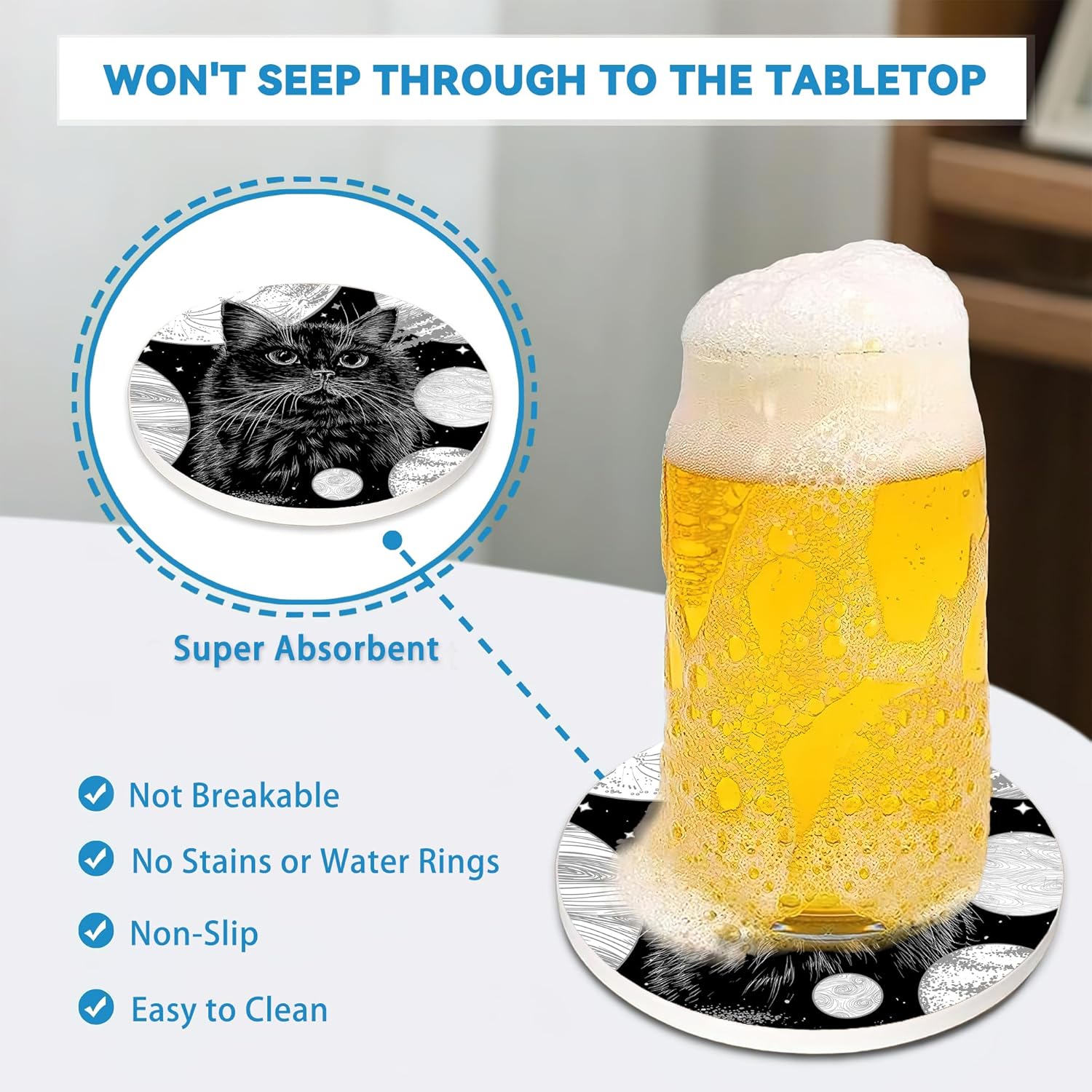 Black Cat Drinks Coasters Set of 4,Ceramic Absorbent Stone Cup Mat with Cork Base,Table Home Decor, Ideal Gifts for Women Men
