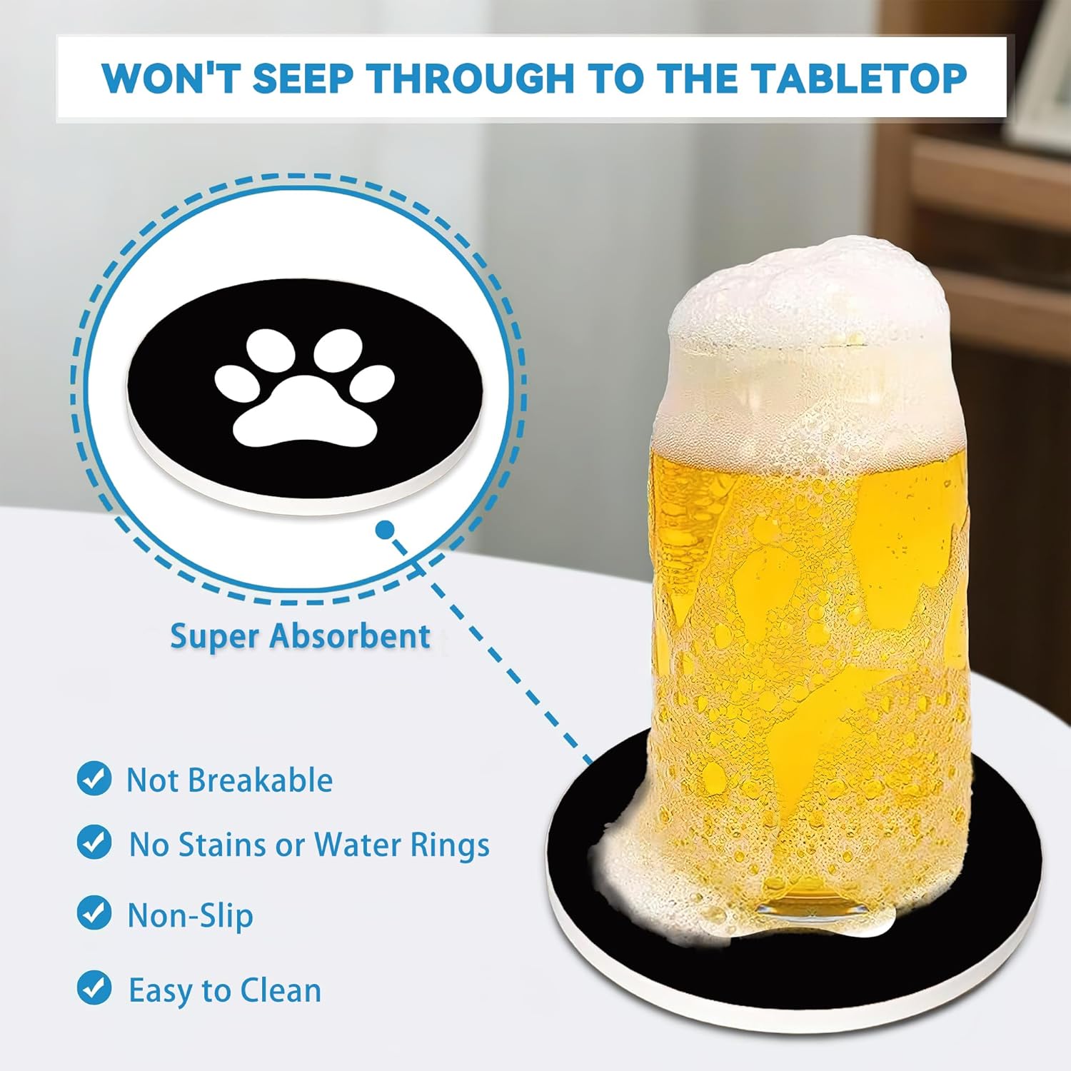 - Our coasters are 4 inches in diameter and can accommodate cocktail glasses, beer mugs, goblets, coffee mugs, plastic cups and other different sizes.