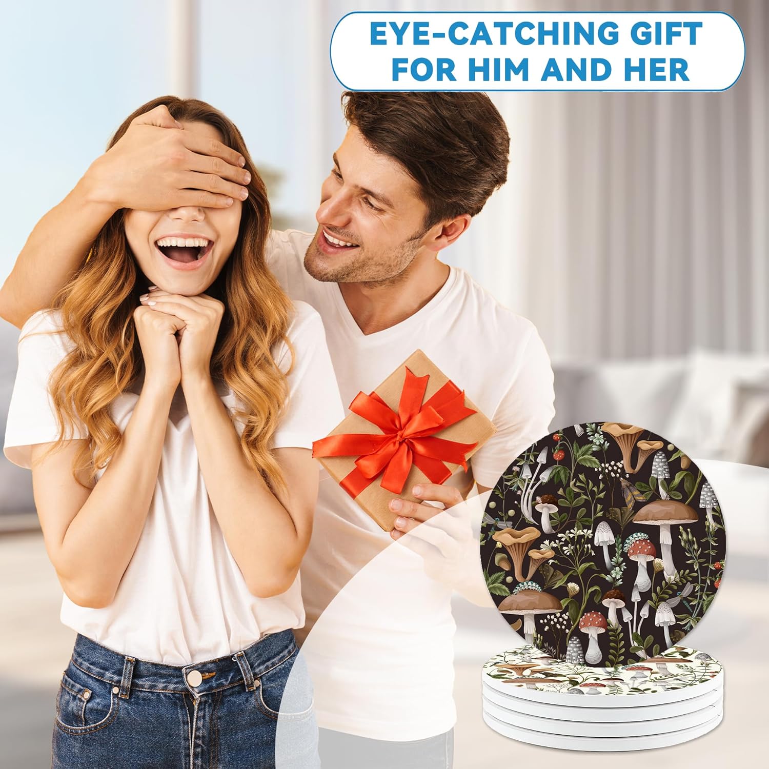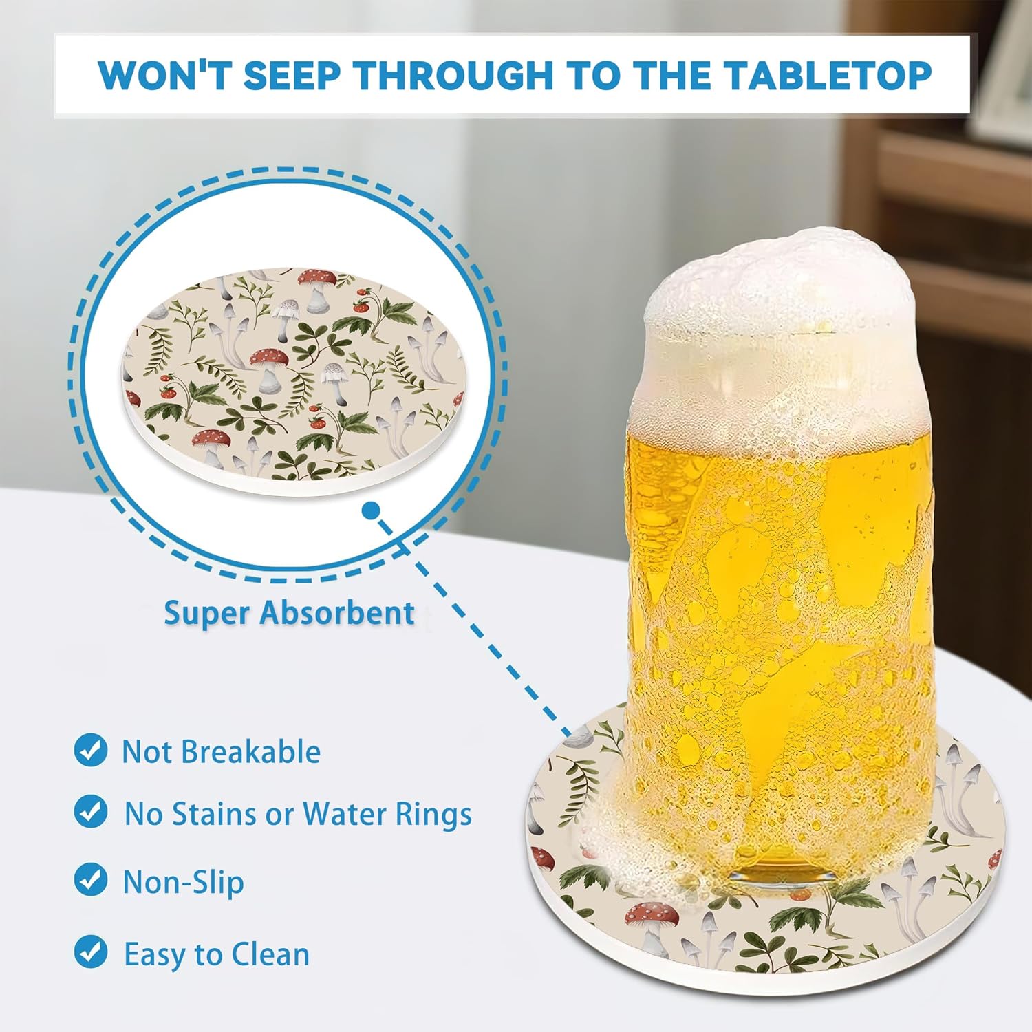 Coasters Set of 4, Mushroom Weeds Round 4" Ceramic & Cork Coasters, Absorbent, Ideal for Table Home Decor, Gifts for Women Men