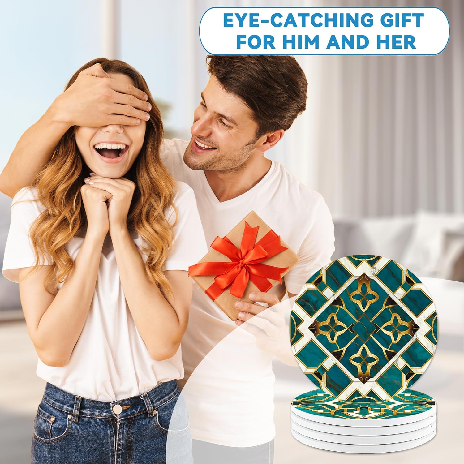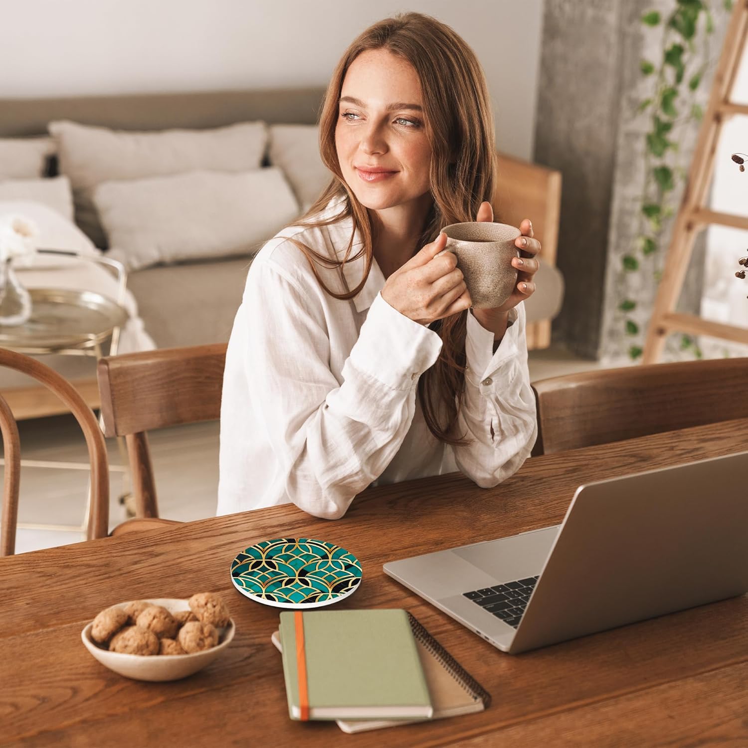 Green Marble Coasters Set of 4, Round Absorbent Ceramic Cup Mat with Cork Base, Cute Coasters for Table Home Decor, Ideal Gifts for Women Men