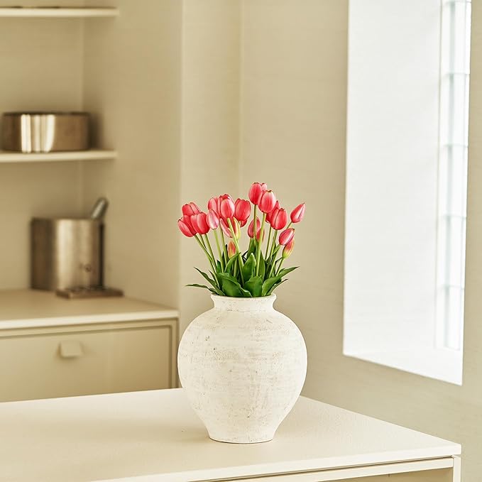 LB2 Large White Ceramic Vase, 11" Tall Zen Style Rustic vase, Terra Cotta Pitcher Vase, Distressed Farmhouse Decor, Pottery Decorative Flower for Home Decor (H 11.8" X 11")