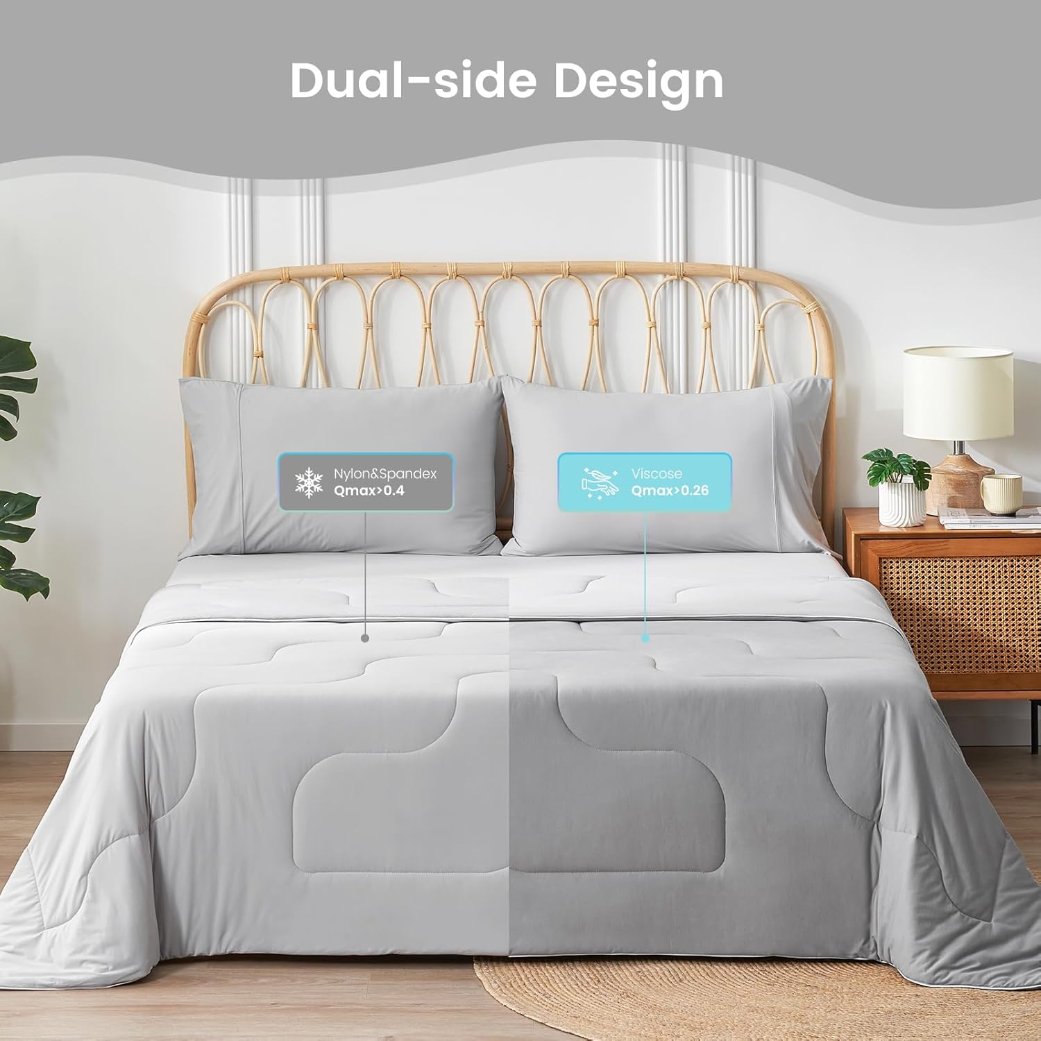 - 【DOUBLE-SIDED DESIGN COOL Comforter】Double-sided cool comforter for sleeping, Cozy Bliss cooling comforter has a 0.4 Q-max side made of Nylon and Spandex for a natural cool feeling. It also has a 0.26 Q-max cooling Viscose side, which is ultra cooling at a touch.