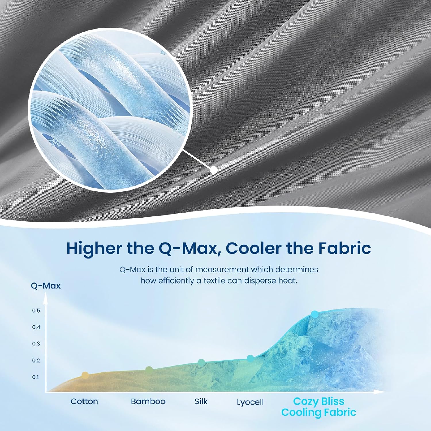 - 【Dual-sided Innovation】Discover the ultimate cooling experience with our Q-Max>0.45 Japanese fabric. Crafted with dense cooling fibers on both sides, our comforter instantly absorbs heat, reducing skin temperature by 2-5°F. One side delivers an intense cooling effect for maximum relief, while the other offers a gentler, more breathable cooling sensation. Stay cool, dry, and comfortable throughout the night, and enjoy personalized comfort for restful sleep in every season.