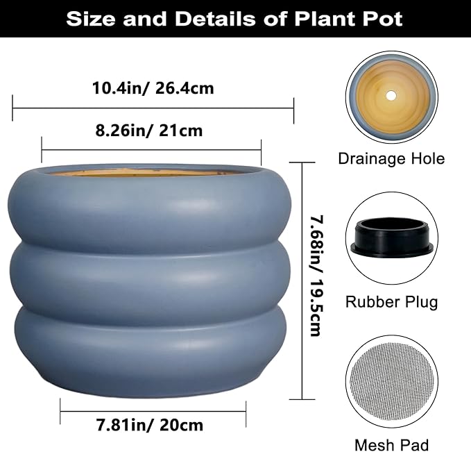 - Suitable Size for Plants: With a diameter of 10.4"/ 26.4cm and height of 7.7"/ 19.5cm, 10 inch plant pot is great for succulent, olive tree, bonsai tree, money tree, monstera, Palm, ficus, fiddle leaf fig, zz plant, indoor and outdoor plants