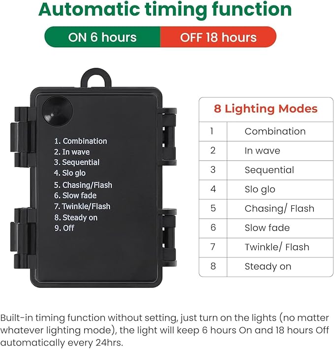 - 【Hands-free Timer for Effortless Schedules】A built-in timer in the battery box keeps lighting on a dependable cycle: 6 hours on, 18 hours off, repeating daily as long as batteries have power. Set it once and enjoy consistent ambience—an effortless upgrade to your Artificial Christmas Trees display on mantels, consoles, or reception desks.