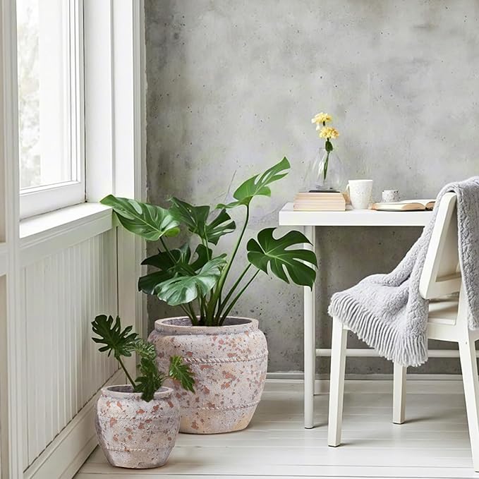 - 【Décor】:The planter has a yellow-white surface with irregular red-brown speckled decorations that add an antique and natural style, a design that allows the planter to better blend into indoor and outdoor environments.