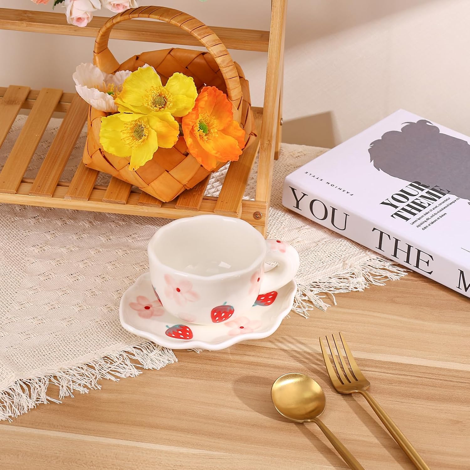 Koythin Ceramic Coffee Mug with Saucer Set, Cute Creative Cup Unique Irregular Saucer Design for Office and Home, 6 oz/180 ml for Latte Tea Milk (Strawberries and Flowers)