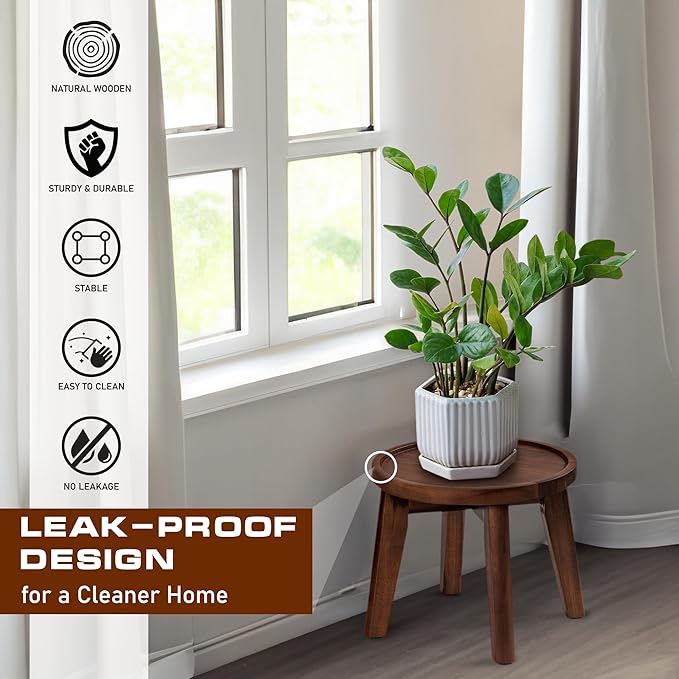 - Water Spill Plant Stand Solution: No one likes water leaking from the pot or saucer, as it can damage wooden floors or furniture. Our plant stand includes a crafted wooden tray with a diameter of 9.8 inches and a slightly raised edge, acting as both a saucer and a protective shield against spills.