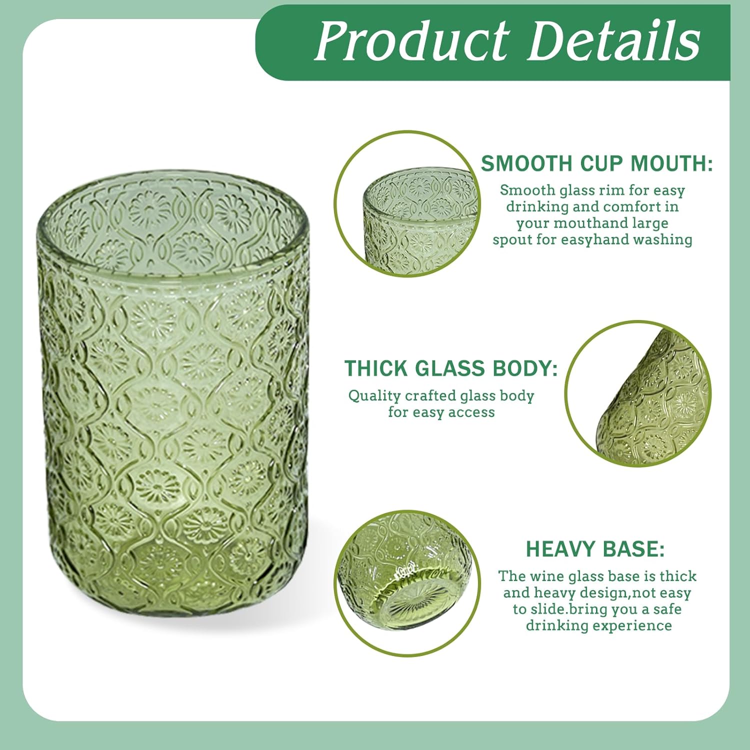 Green Vintage Drinking Glasses Set of 6, 14 oz hobnail drinking glasses Glassware Embossed Green Water Tumbler for Beer, Juice, Cocktail, Whiskey, Milk