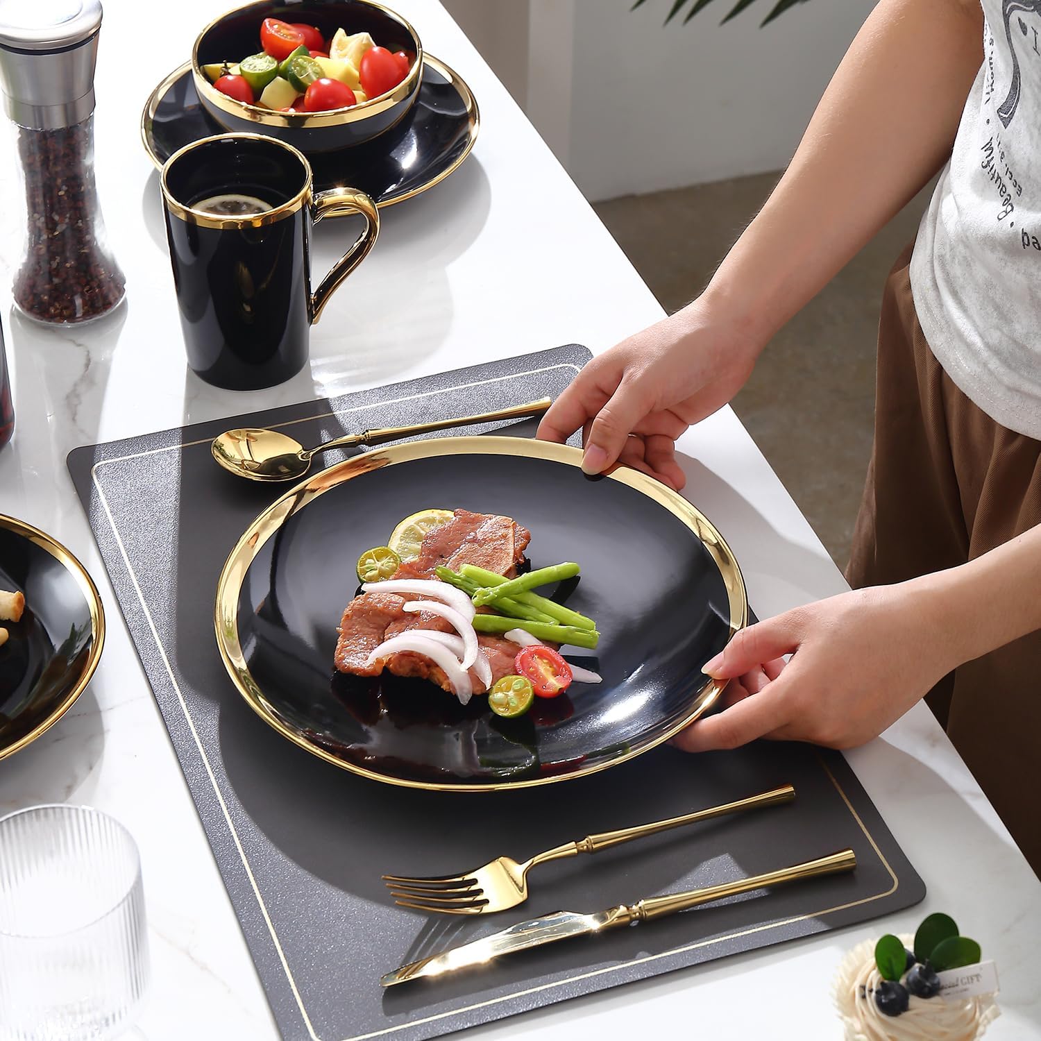 - 【Modern-Luxe Design: Black Porcelain with Gold Trim】 Command attention with these black plates with gold trim, crafted from high-quality, chip-resistant ceramic. The deep solid black body is elegantly framed by a shimmering gold trim, making this black and gold dinnerware set a touch of modern opulence for your table.