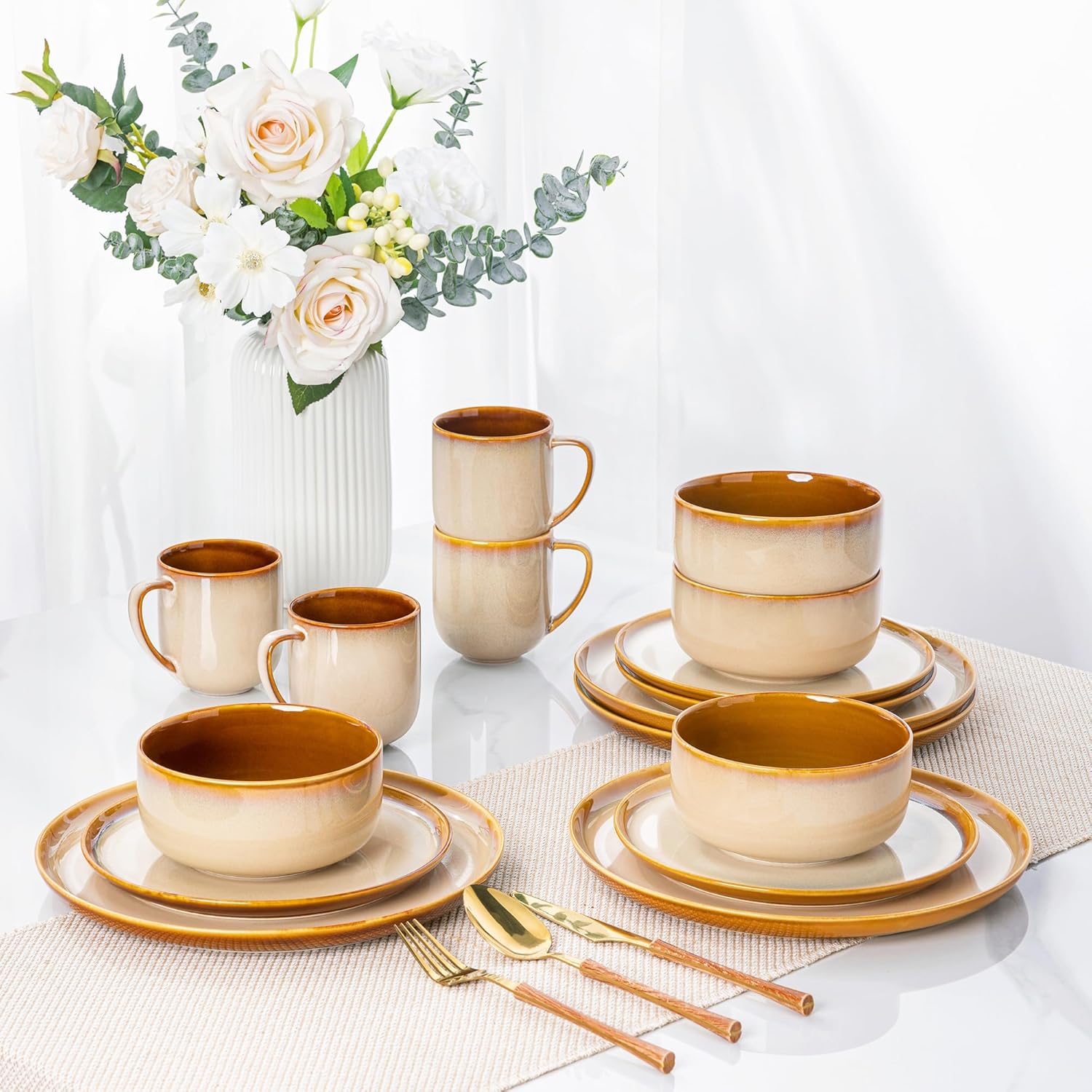 LERATIO Ceramic Dinnerware Sets for 4,16-PieceReactive Glaze Plates and Bowls Set with Mugs,Highly Chip and Crack Resistant | Dishwasher,Microwave & Oven Safe Dishes set-Kahki