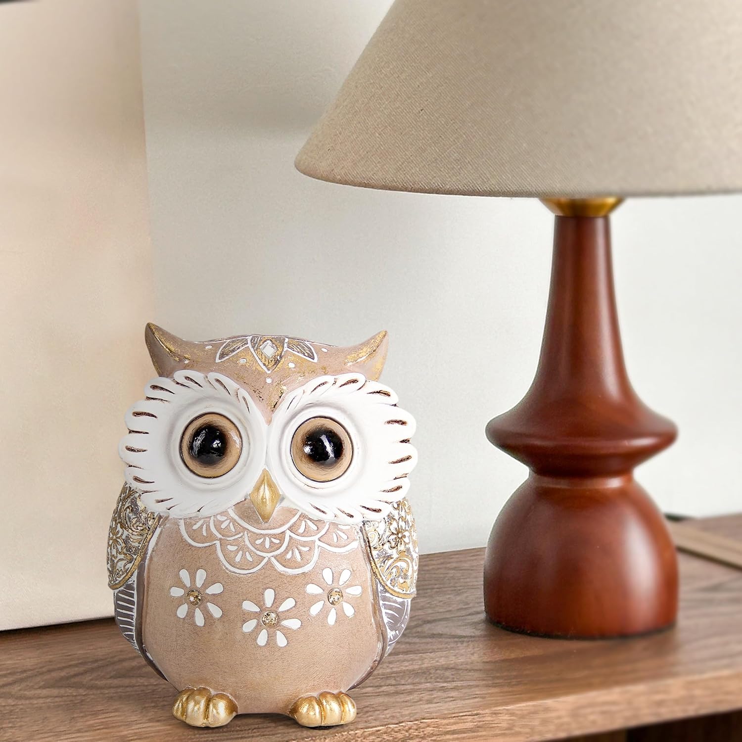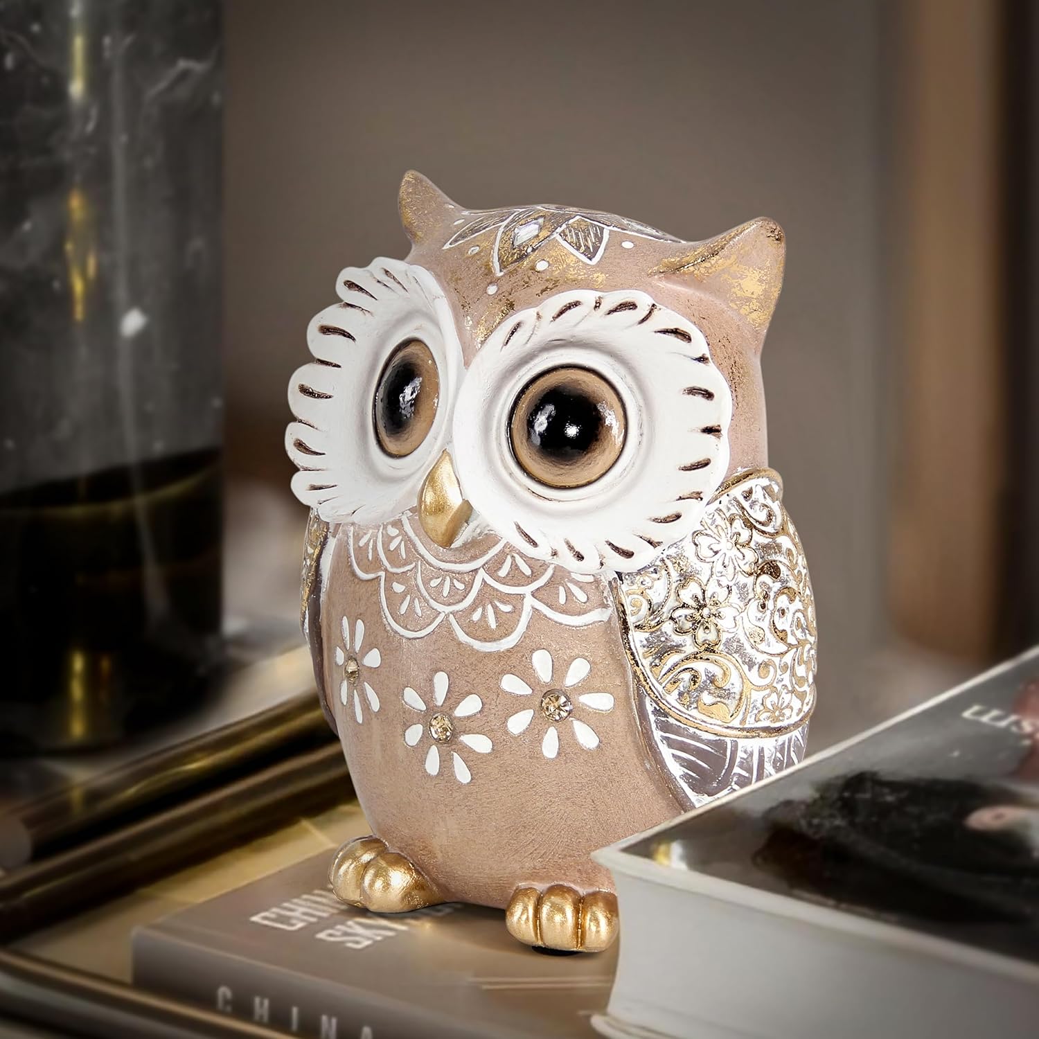 - Owl statue:The owl statue measures is 5.3*4.3*2.7inch, hand-painted with very nice details and good workmanship, designed with a vivid big eyes and beautiful gold patterns, this adorable gold owl figurine perfect for indoor decorations and it will adds a whimsical touch to your home decor accents
