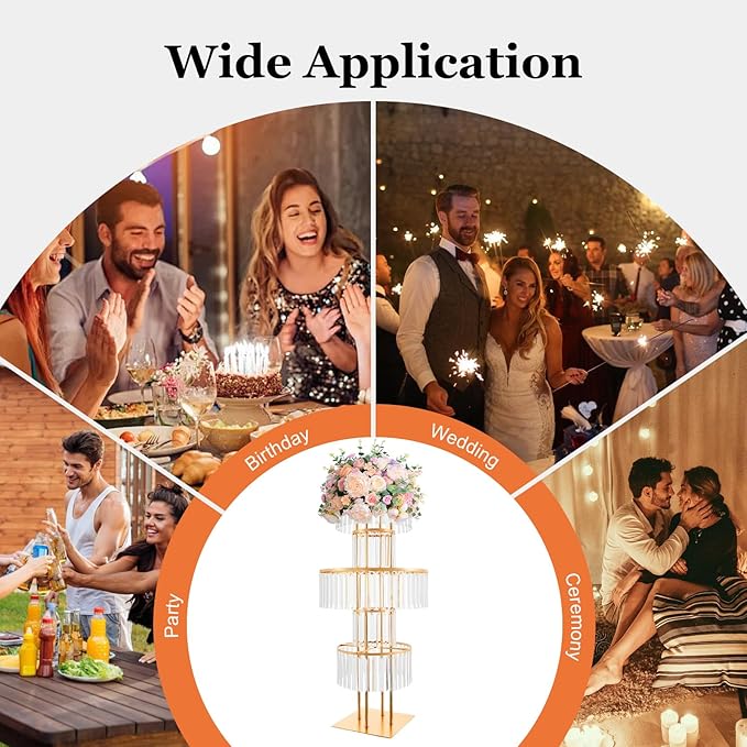- πΎππ π π¨ππππππππππ: The gold flower stand centerpiece is suitable to be the decoration in the formal dining room, party, birthday, coffee shop, bar, hotel, aisle road guide, wedding banquet, festival, birthday party, bachelor party, commencement ceremony, graduation party, buffet, Christmas activity site, New Year activity site, commercial celebration activity site, and photo booth