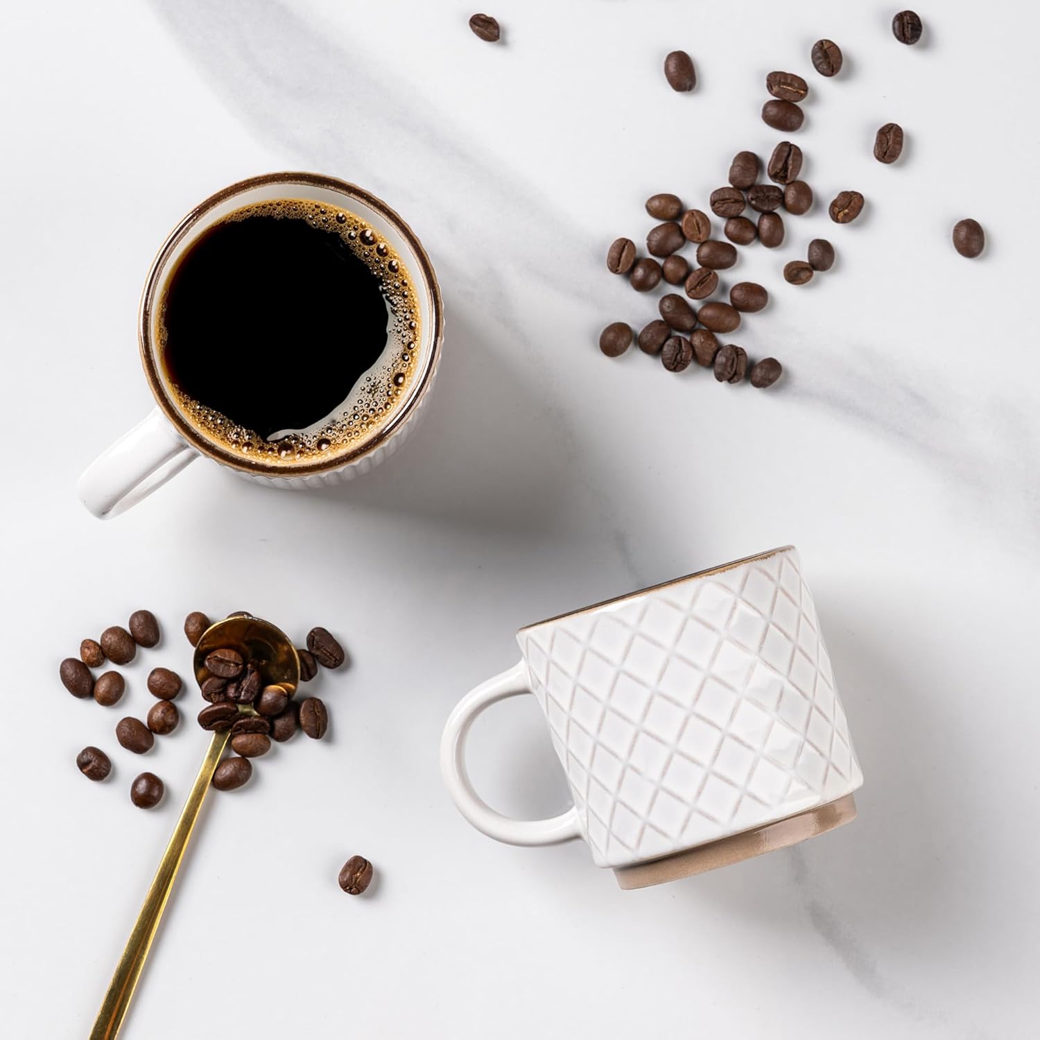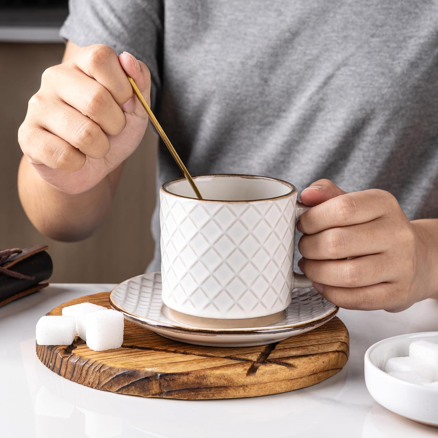- Stackable and Modern Design: These ceramic mugs feature a beautiful embossed texture design, the smooth rim ensures a comfortable drinking experience, the stackable design allows for easy storage and helps save space in your kitchen.