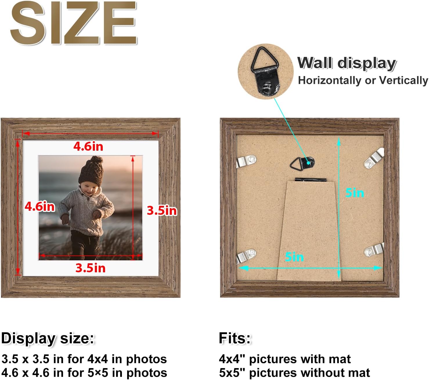 - SOLID WOOD:Kinlink square 5x5 wood frames are fitting for pictures 4x4 with mat and standard pictures 5x5 without mat. Made from high-quality light weight solid wood with transparent acrylic glass front that gives a clear view of your picture and preserves your precious memories as well. It is worth noticing that remove the protective film on the glass before use.