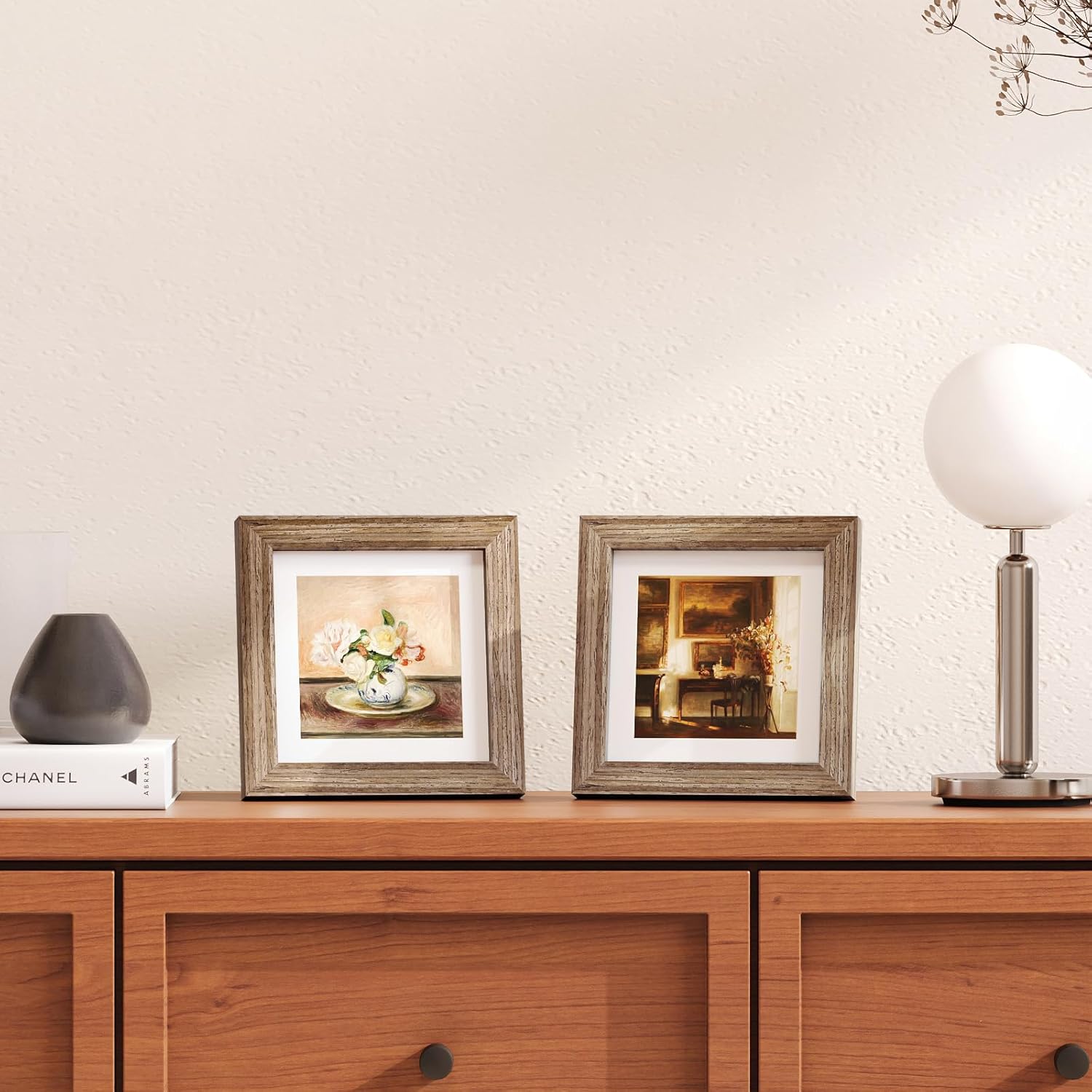 - ATTRACTIVE DESIGN:The 5x5 picture frames exhibit brown wood color and curved bevel. Their smooth wood grain lines can almost complement any decorative styles. The simple outlook combined with exquisite details, which is suitable for highlighting your valuable memorable times.